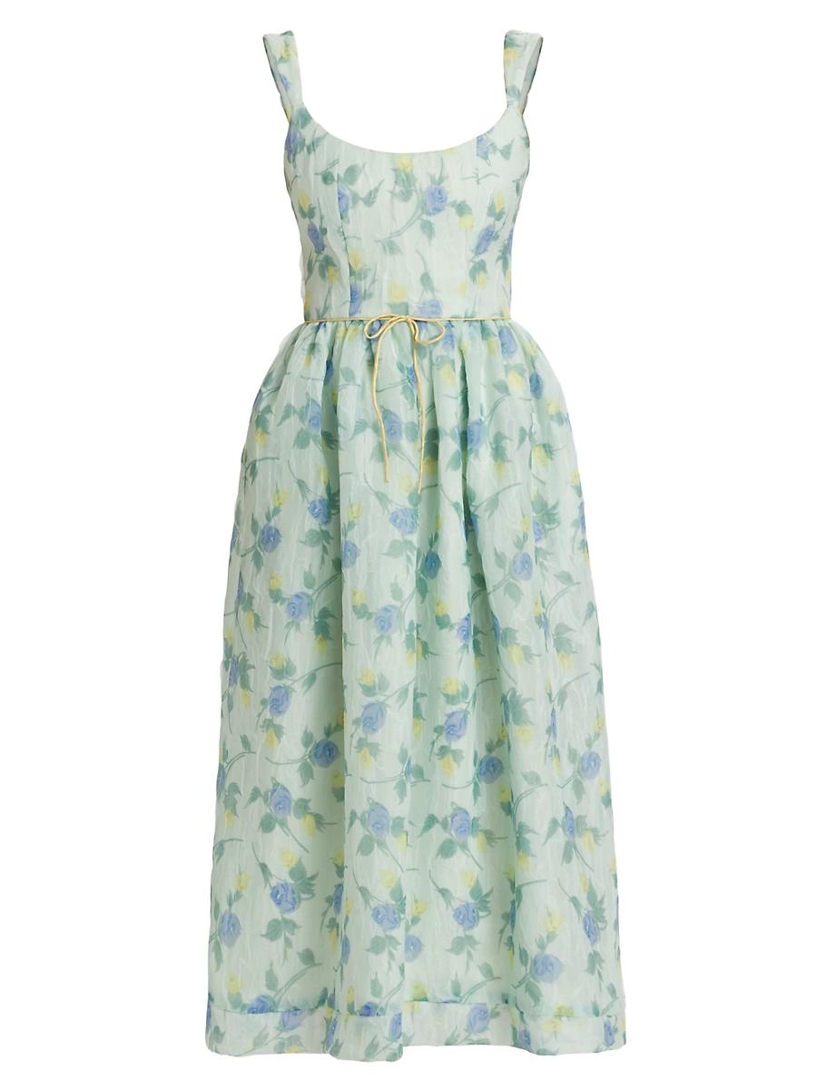 This fit-and-flare dress has charming floral brocade matched with dupioni spaghetti ties at the waist. Scoopneck Sleeveless Back zip closure 100% silk Dry clean Made in USA of UK fabric SIZE & FIT About 45 from topline to hem Model measurements: 510 tall Model is wearing a US size 4. Designer Evening - Classic Evening > Markarian > Saks Fifth Avenue > Barneys. Markarian. Color: Blue Green. Size: 6.