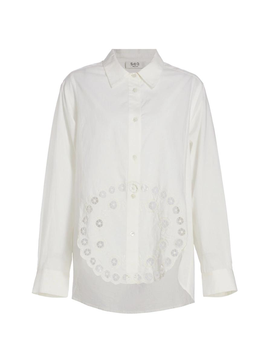 Crafted of breezy cotton, Seas Arabella shirt features a classic point collar and circular embroidered design at the front hem. Point collar Long sleeves, buttoned cuffs Shirttail hem Button-front closure 100% cotton Dry clean Imported SIZE & FIT About 28 from shoulder to hem Model measurements: 510 tall Model is wearing a US size Small. Contemporary Sportswear - Workshop > Sea > Saks Fifth Avenue > Barneys. Sea. Color: Cream. Size: Medium.
