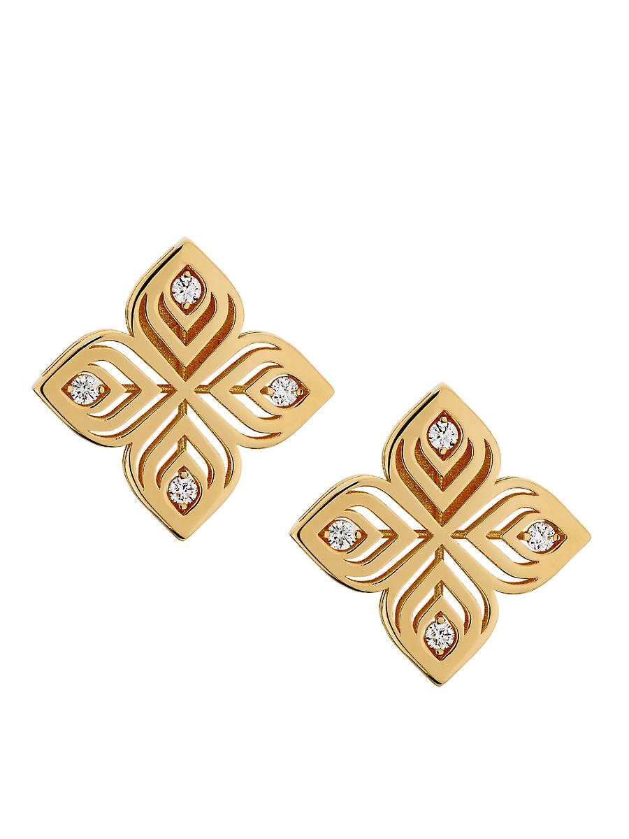 From the Arabesque Collection. These Arabesque earrings from Roberto Coin feature intricate 18K yellow gold adorned with four glittering diamonds.Roberto Coin signs each piece with a single ruby placed in a hidden position. Diamonds, 0.15 tcw Diamond color: GH Diamond clarity: S1 18K yellow gold Post back Made in Italy SIZE About 1W ABOUT THE BRAND Jewelry designer Roberto Coin founded his eponymous line in 1996, with a strong emphasis on elegance and creative experimentation. Each piece is the result of a long creative process, taking inspiration from cultural influences and nature. Fine Jewelry - Roberto Coin Asset > Roberto Coin > Saks Fifth Avenue > Barneys. Roberto Coin. Color: Yellow Gold.