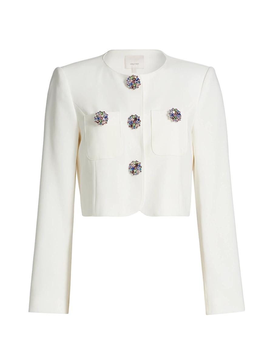 Cut in a cropped silhouette,Cinq Septs Auden collarless jacket features multicolor crystal embellished brooch-like buttons. Roundneck Long sleeves Chest patch pockets Button-front closure 69% triacetate/31% polyester Dry clean Imported SIZE & FIT About 18 from shoulder to hem Model measurements: 510 tall Model is wearing a US size 4 ABOUT THE BRAND Inspired by the radiant, magical hours between 5 and 7 PM-which is what the labels French name translates to-founder Jane Siskin designs sophisticated, feminine pieces for both workweek and the weekend. The designers silhouettes also play with volume and eye-catching trimmings-perfect for cocktails or a special night out. Contemporary Sportswear - Cinq A Sept > Cinq Sept > Saks Fifth Avenue > Barneys. Cinq Sept. Color: Ivory. Size: 0.