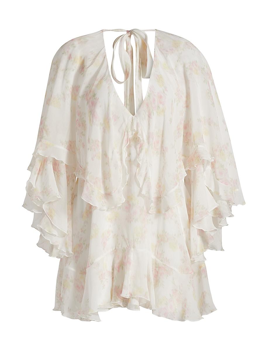 This flowing Avaline V-neck minidress from LoveShackFancy features a delicate floral print, a plunging V-neck, and ruffle detailing. Plunging V-neck Elbow-length flutter sleeves Back zip closure 100% rayon Lining: 100% polyester Hand wash Imported SIZE & FIT About 33.5 from shoulder to hem Model measurements: 510 tall Model is wearing a US size Small. Contemporary Sportswear - Trend > Loveshackfancy > Saks Fifth Avenue. LoveShackFancy. Color: White Peach. Size: Medium.