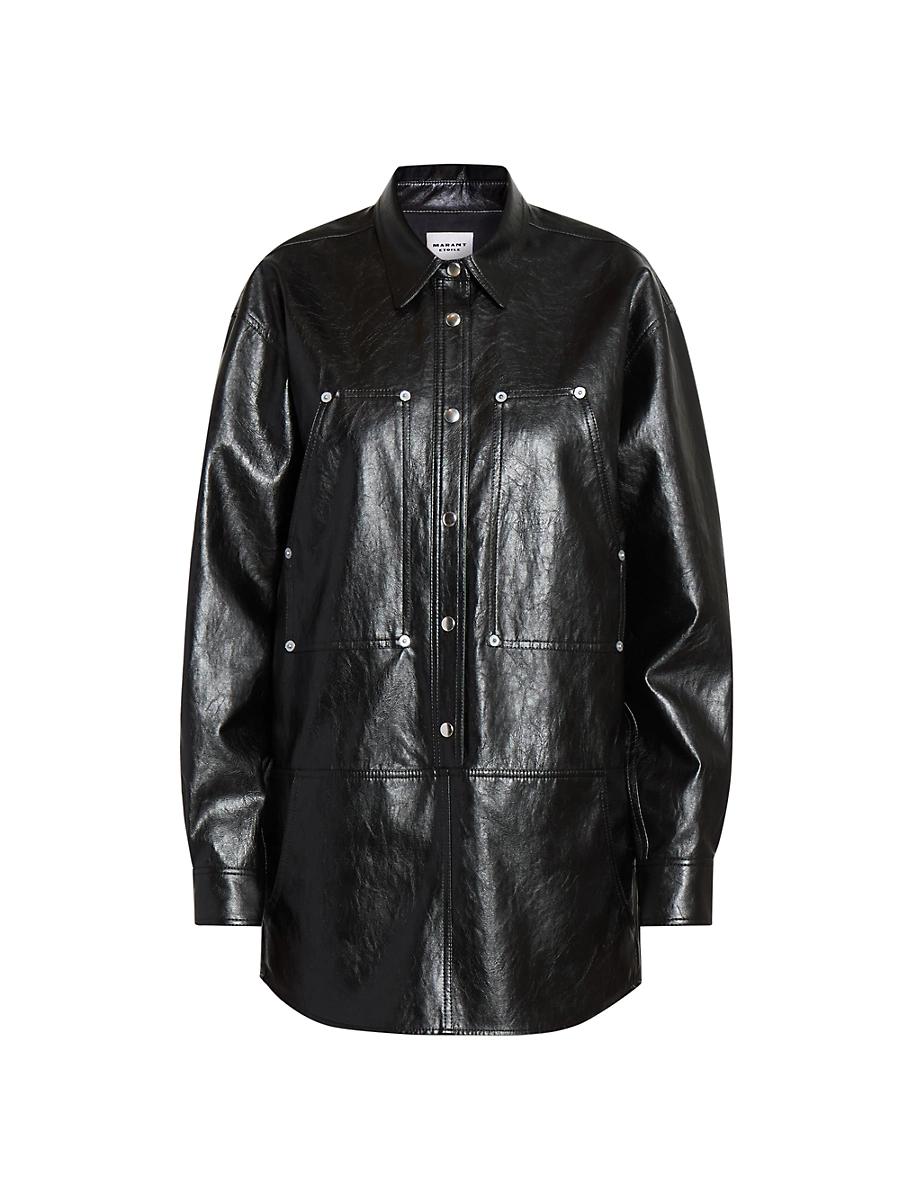 Crafted of crushed faux leather, this shirtdress from Isabel Marant Etoil features shirt-inspired styling and silvertone snap closures. Point collar Drop shoulders Long sleeves, button cuffs Chest and waist slip pockets Snap-front closure 58% polyurethane/26% viscose/5% other fibers/5% cotton/4% polyester/2% stainless steel Dry clean Imported SIZE & FIT Model measurements: 510 tall Model is wearing a US size 4 ABOUT THE BRAND Anyone looking for a laid-back blend of bohemian and Parisian-chic knows to turn to Isabel Marant. Since 1994, her namesake label has been the go-to for textured knitwear, flowing dresses and Western-inspired accessories. Contemporary Sportswear - Workshop > Isabel Marant toile > Saks Fifth Avenue > Barneys. Isabel Marant toile. Color: Black. Size: 8.