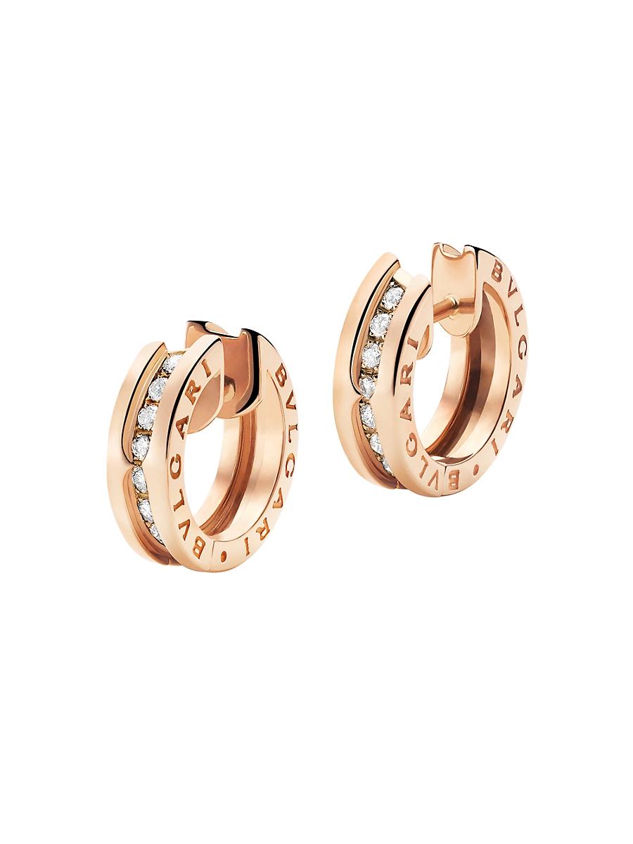 From the B.Zero1 Collection. Crafted of polished 18K rose gold, BVLGARIs huggie hoop earrings are accented with glittering pav white diamonds and engraved with logo lettering. This pairs distinctive spiral silhouette is inspired by the magnificent architecture of the Colosseum in Rome, Italy. Diamonds, 0.18 tcw 18K rose gold Hinged snap clasp Made in Italy SIZE Diameter, about 0.5 ABOUT THE BRAND Founded in Italy in 1884 by Greek silversmith Sotirio Bulgari, BVLGARI has become synonymous with unparalleled craftsmanship and exquisite jewelry. The brands Roman heritage can be seen in pieces inspired by the citys architecture, artwork and ancient mosaics. Today, the house continues to translate its rich history into opulent designs and fragrances. Fine Jewelry - Bvlgari Watches And Jewe > Bvlgari > Saks Fifth Avenue > Barneys. BVLGARI. Color: Rose Gold.