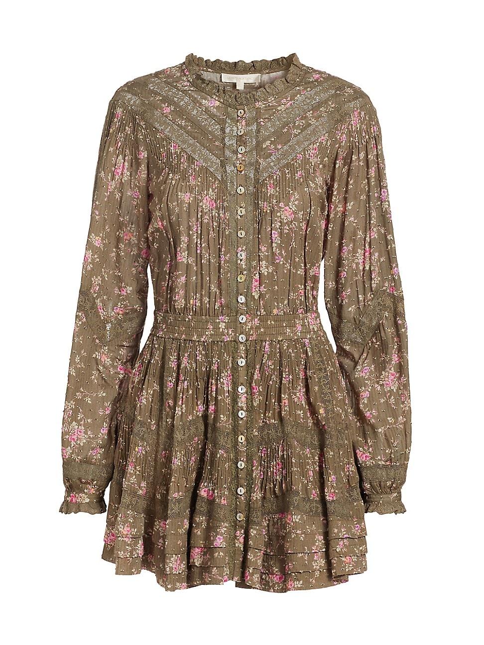 From the Ballet of Blooms Collection. LoveShackFancys Calia minidress is designed with delicate floral print. Shaped by tiny pleats, this style features a smocked waistband and inset lace. Ruffled collar Long sleeves, ruffled cuffs Pleated yoke Smocked waistband Tiered hem Button-front closure 100% viscose Lining: 100% cotton Dry clean Imported SIZE & FIT About 33.25 from shoulder to hem Model measurements: 510 tall Model is wearing a US size Small. Contemporary Sportswear - Trend > Loveshackfancy > Saks Fifth Avenue > Barneys. LoveShackFancy. Color: Bancha Green. Size: XS.