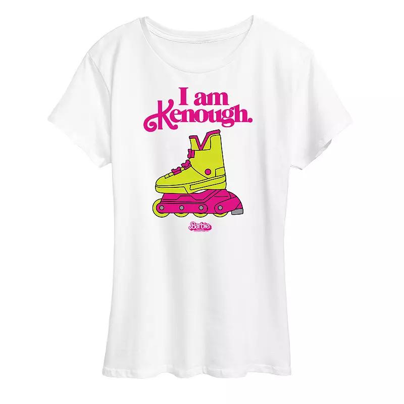 White Barbie I Am Kenough Rollerblades Graphic Tee - Women & Plus. A stylish cotton tee adorned with unique graphic design that displays personality. Full graphic text: I am Kenough.Size S: 26 long from high point of shoulder to hemSize & fit: Relaxed-fit garment with a slightly longer hem. Fits true to size.100% cottonMachine wash; tumble dryImported, screen printed in the USA