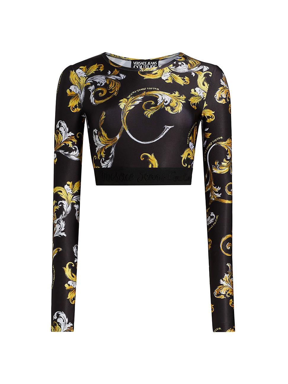 Flaunting the brands signature Barocco motif, this cropped T-shirt from Versace Jeans Couture is cut for a body-hugging fit. An elasticized logo waistband defines the hem. Crewneck Long sleeves Pulls over 80% nylon/20% elastane Dry clean Made in Italy SIZE & FIT This style is constructed in a stretch fabric for a slim fit About 13.5 from shoulder to hem Model measurements: 510 tall Model is wearing a US size 4 ABOUT THE BRAND Founded in 1978, Versace is instantly recognizable by the signature Medusa head logo, chosen by founder Gianni Versace for its Greek symbolism. The Italian label is known for its luxe, bold clothing and accessories-think gilding, oversized logos and punchy prints. Since taking over artistic direction, Giannis sister Donatella Versace has maintained the brands strong identity, with a renewed vision to give customers the ultimate freedom to express themselves. Contemporary Sportswear - Trend > Versace Jeans Couture > Saks Fifth Avenue > Barneys. Versace Jeans Couture. Color: Black Gold. Size: 10.