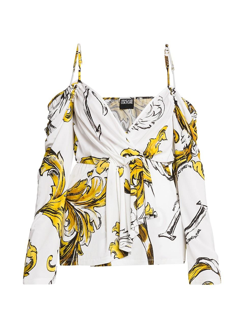 Made in Italy, this blouse from Versace Jeans Couture features a baroque print, an off-the-shoulder neckline, and adjustable spaghetti straps. Off-the-shoulder neckline Surplice neck Adjustable spaghetti straps Long sleeves Pulls over 90% viscose/10% elastane Hand wash Made in Italy SIZE & FIT Model measurements: 510 tall Model is wearing a US size 4 ABOUT THE BRAND Founded in 1978, Versace is instantly recognizable by the signature Medusa head logo, chosen by founder Gianni Versace for its Greek symbolism. The Italian label is known for its luxe, bold clothing and accessories-think gilding, oversized logos and punchy prints. Since taking over artistic direction, Giannis sister Donatella Versace has maintained the brands strong identity, with a renewed vision to give customers the ultimate freedom to express themselves. Contemporary Sportswear - Trend > Versace Jeans Couture > Saks Fifth Avenue > Barneys. Versace Jeans Couture. Color: White Gold. Size: 12.
