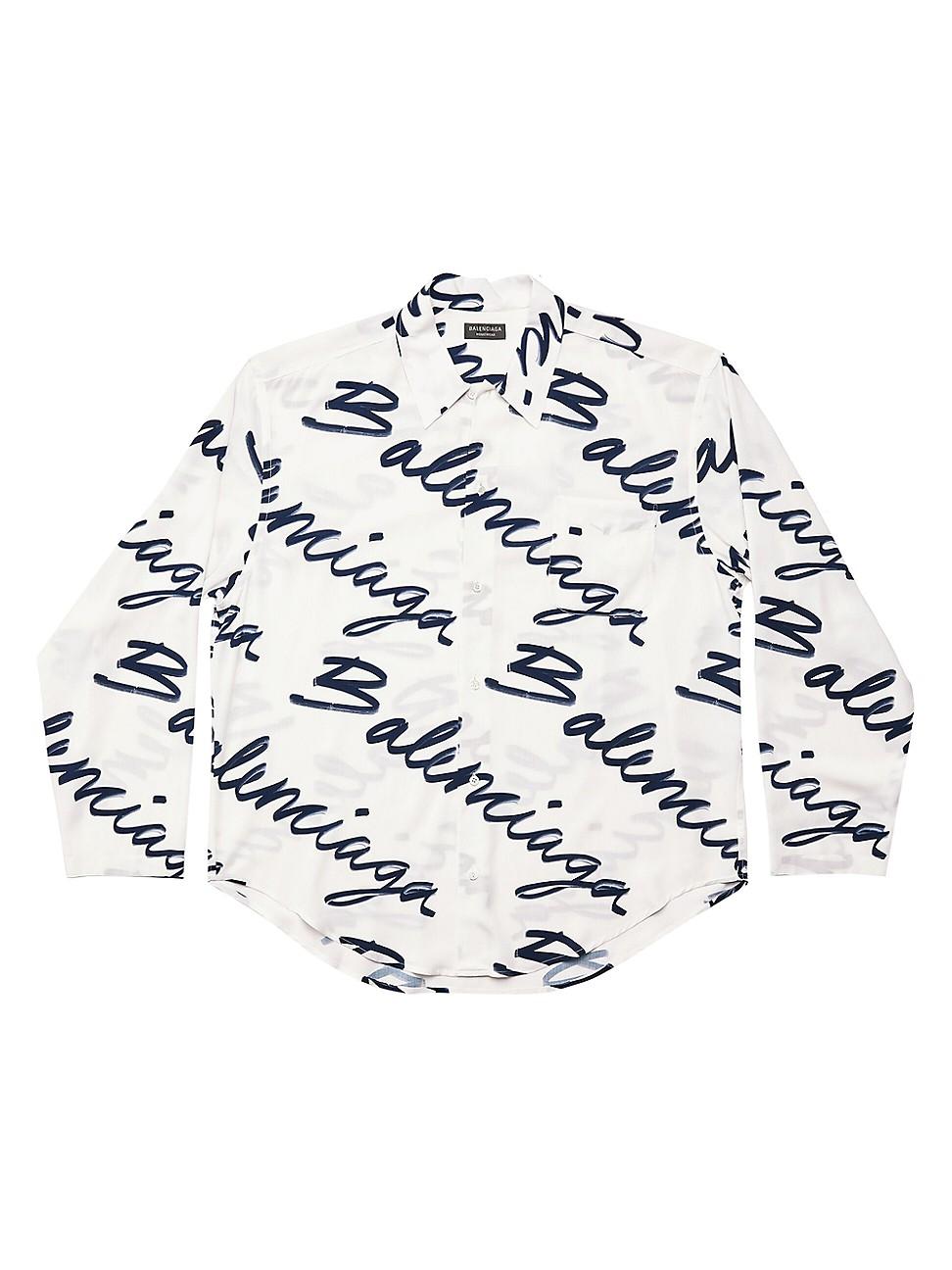 BB Monogram Minimal Shirt Large Fit in silk crepe. BB monogram printed silk crepe Large fit Button-down collar 6 button front 1 patch pocket at chest Long sleeves Rounded bottom Balenciaga engraved buttons Made in Madagascar Dry cleaning. Lsd Rtw - Balenciaga Rtw > Balenciaga > Saks Fifth Avenue > Barneys. Balenciaga. Size: 0.