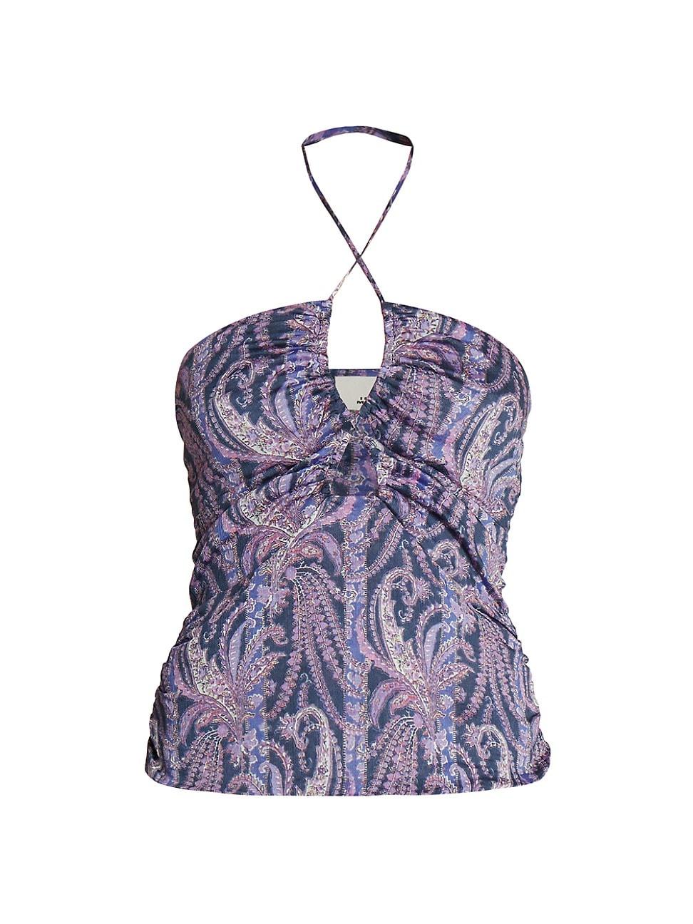 Isabel Marants Becki halter top showcases a paisley print and a notched front. Halterneck Sleeveless Nape self-tie 76% cotton/24% silk Lining: 100% viscose Dry clean Imported SIZE & FIT About 25 from topline to hem Model measurements: 510 tall Model is wearing a US size 4 ABOUT THE BRAND Anyone looking for a laid-back blend of bohemian and Parisian-chic knows to turn to Isabel Marant. Since 1994, her namesake label has been the go-to for textured knitwear, flowing dresses and Western-inspired accessories. Advanced Designer - Designer Emerging Brands > Isabel Marant > Saks Fifth Avenue > Barneys. Isabel Marant. Color: Faded Night. Size: 12.