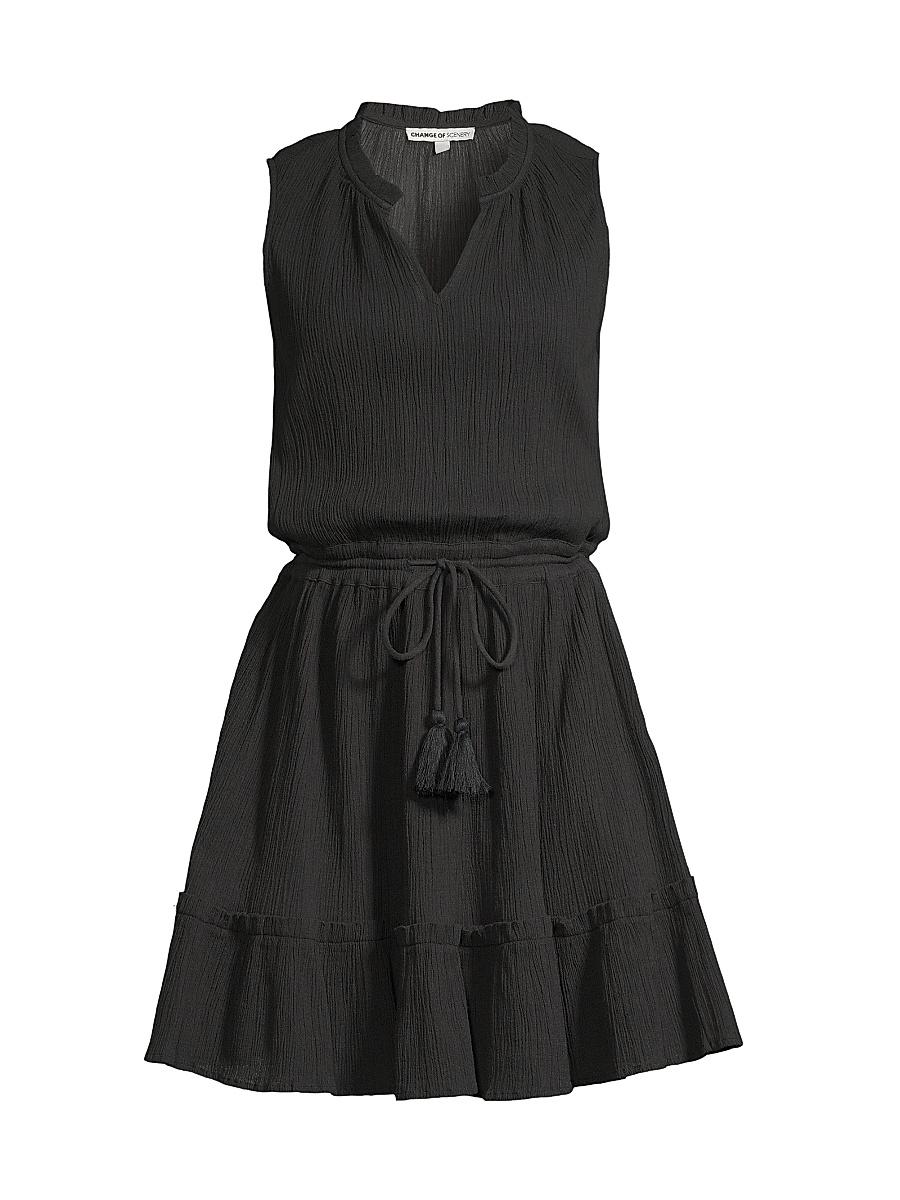 Change of Scenerys Beth minidress is a versatile day-to-night style providing maximum comfort with its elastic waistband and adjustable drawstring tie. The style features a tasteful v-notch neckline, a flirty ruffled skirt, and convenient side seam pockets. V-neck Sleeveless Elasticized drawstring waist Side on-seam pockets Pulls over 100% cotton Machine wash Imported SIZE & FIT About 35 from shoulder to hem Model measurements: 510 tall Model is wearing a US size Small ABOUT THE BRAND Born i