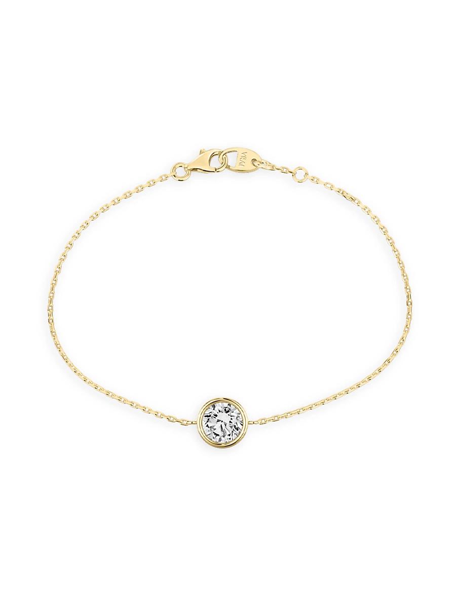 From the Bezel Essentials Collection. The Brilliant Round Bezel Solitaire bracelet combines vintage-inspired detail with modern appeal for a timelessly elegant look with a solid 14K gold bezel setting and a matching chain to outline the distinctive form of the Vrai lab-created baguette shape, while drawing in and bouncing light in every direction. Lab-created diamonds, 0.50 tcw Diamond color: G-J Diamond clarity: VS2+ 14K yellow gold Trigger clasp Made in USA SIZE Length, about 6.5 with 0.5 extender Please note: This item ships directly from the vendor and may take up to 10 business days after the order is placed. Fine Jewelry - Lab Grown Designer C > Vrai > Saks Fifth Avenue > Barneys. VRAI. Color: Yellow Gold.