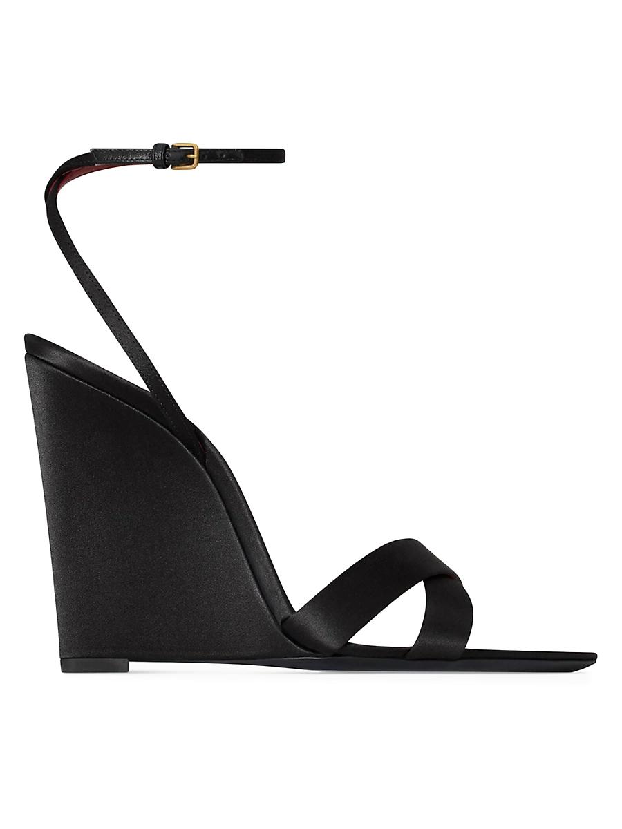 Saint Laurent Womens Bibi Wedges in Satin Crepe.Color:Black.Size:7 US / 37 EU.Material:65% Viscose, 20% Silk, 10% Sheepskin, 5% Metal.