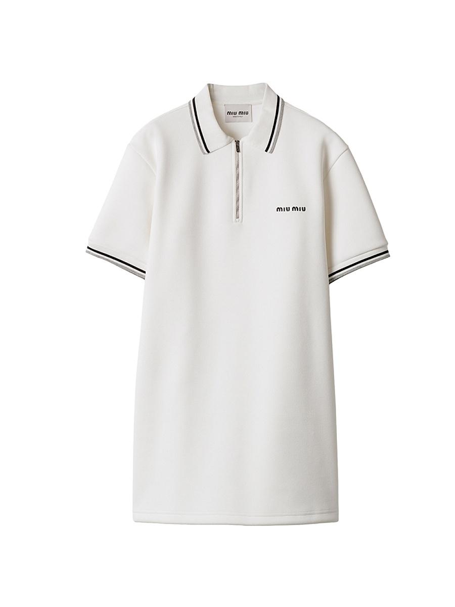 Straight fit Short sleeves Knit collar Front zipper closure Embroidered logo Hem with side slits Knit trim on the collar and hem Imported 100% Cotton - 100% Polyester. Lsd Handbags - Miu Miu > Miu Miu > Saks Fifth Avenue > Barneys. Miu Miu. Color: White. Size: 4.