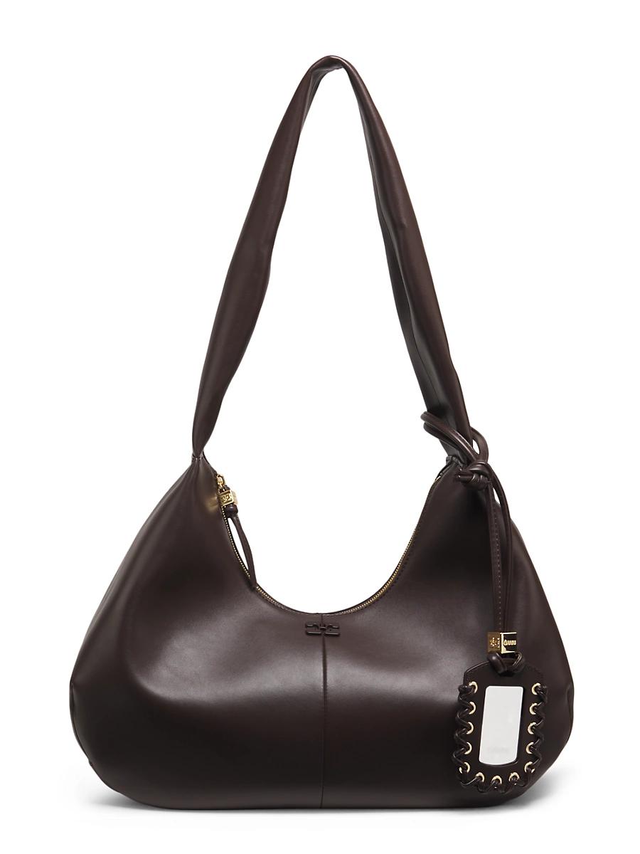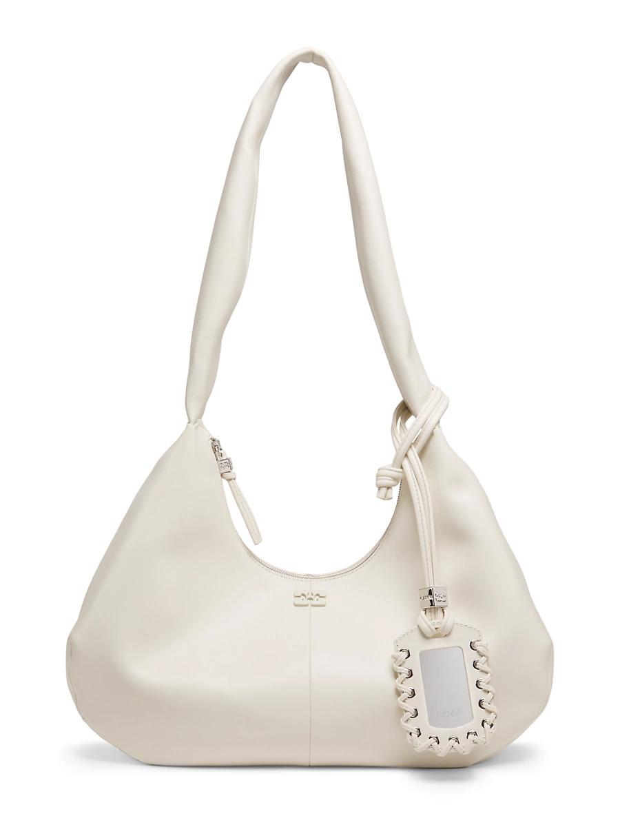 The Bou hobo bag from Ganni is crafted of leather in a slouchy silhouette. A removable mirror compact accessory with woven trim lends a playful addition to this style. Shoulder strap Includes mirror accessory Interior: one zip pocket Open compartment Top zip closure Leather/ polyurethane/ polyester Imported SIZE About 17.5 L x 6 W x 12 H. Handbags - Collection Handbags > Ganni > Saks Fifth Avenue > Barneys. Ganni. Color: Egret.