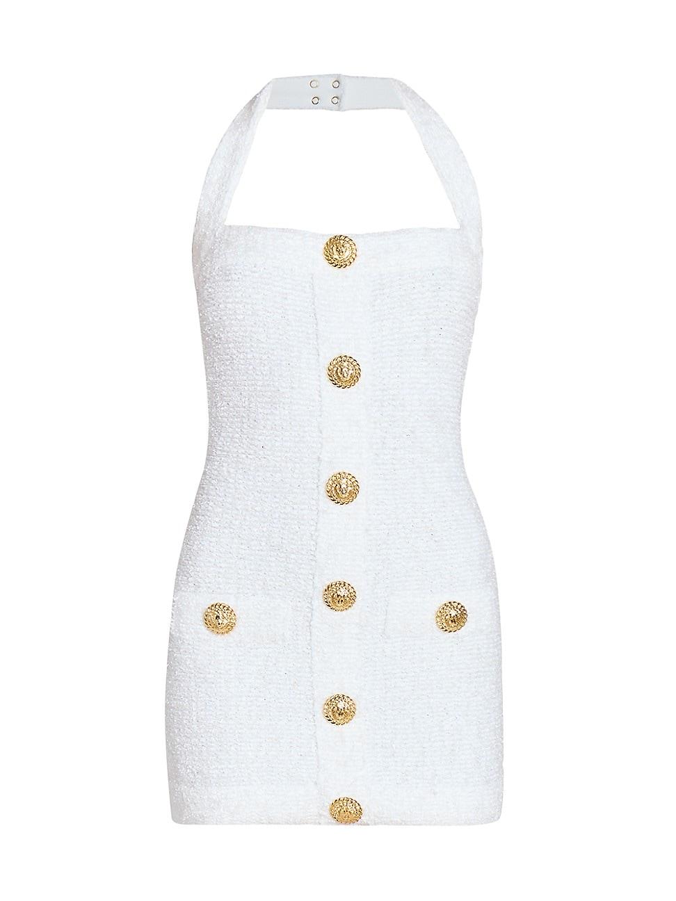 Made in France, this Balmain boucl halter minidress features decorative metallic buttons and a fitted silhouette. Halterneck Decorative button front Faux front pockets Back snap and zip closure 38% cotton/36% viscose/18% polyamide/8% polyester Dry clean Made in France SIZE & FIT About 33 from shoulder to hem Model measurements: 510 tall Model is wearing a US size 4 Please Note: This style runs small. ABOUT THE BRAND In 1945, founder Pierre Balmain made his well-received debut of opulent, ultra-feminine designs. Known today for its iconic blazers, impeccably constructed dresses and signature fragrances, the brand continues its dedication to masterful tailoring and elegance under the helm of Creative Director Olivier Rousteing. Advanced Designer - Balmain > Balmain > Saks Fifth Avenue > Barneys. Balmain. Color: Blanc. Size: 14.