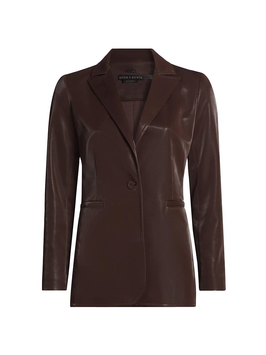 Crafted of faux leather with a shiny finish, Alice + Olivias Breann blazer is cut with with notch lapels and a single-breasted silhouette. Notch lapels Long sleeves, button cuffs Side pockets Single breasted button closure 100% polyurethane Backing: 100% polyester Lining: 100% polyester Dry clean Imported SIZE & FIT Tailored fit About 29 from shoulder to hem Model measurements: 510 tall Model is wearing a US size 4 Small ABOUT THE BRAND Founder Stacey Bendet has been embracing bold color, eclectic prints and an overall passion for whimsy since launching Alice + Olivia in 2002. From party-ready dresses to statement tops and everything in between, shes created a playful and overtly feminine aesthetic thats uniquely her own. Contemporary Sportswear - Alice + Olivia > Alice + Olivia > Saks Fifth Avenue > Barneys. Alice + Olivia. Color: Espresso. Size: 14.