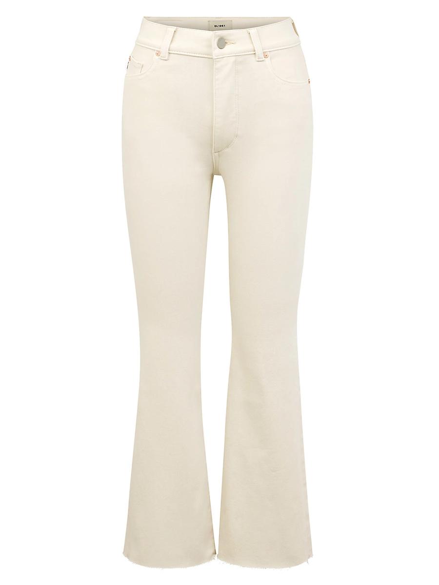 DL1961 Premium Denim Bridget bootcut jeans featuring a raw hem in colored denim Approx. 10 rise; 27 inseam High rise Five-pocket style Fitted through the hip and thigh Cropped length Button/zip fly; belt loops Cotton Machine wash cold Imported