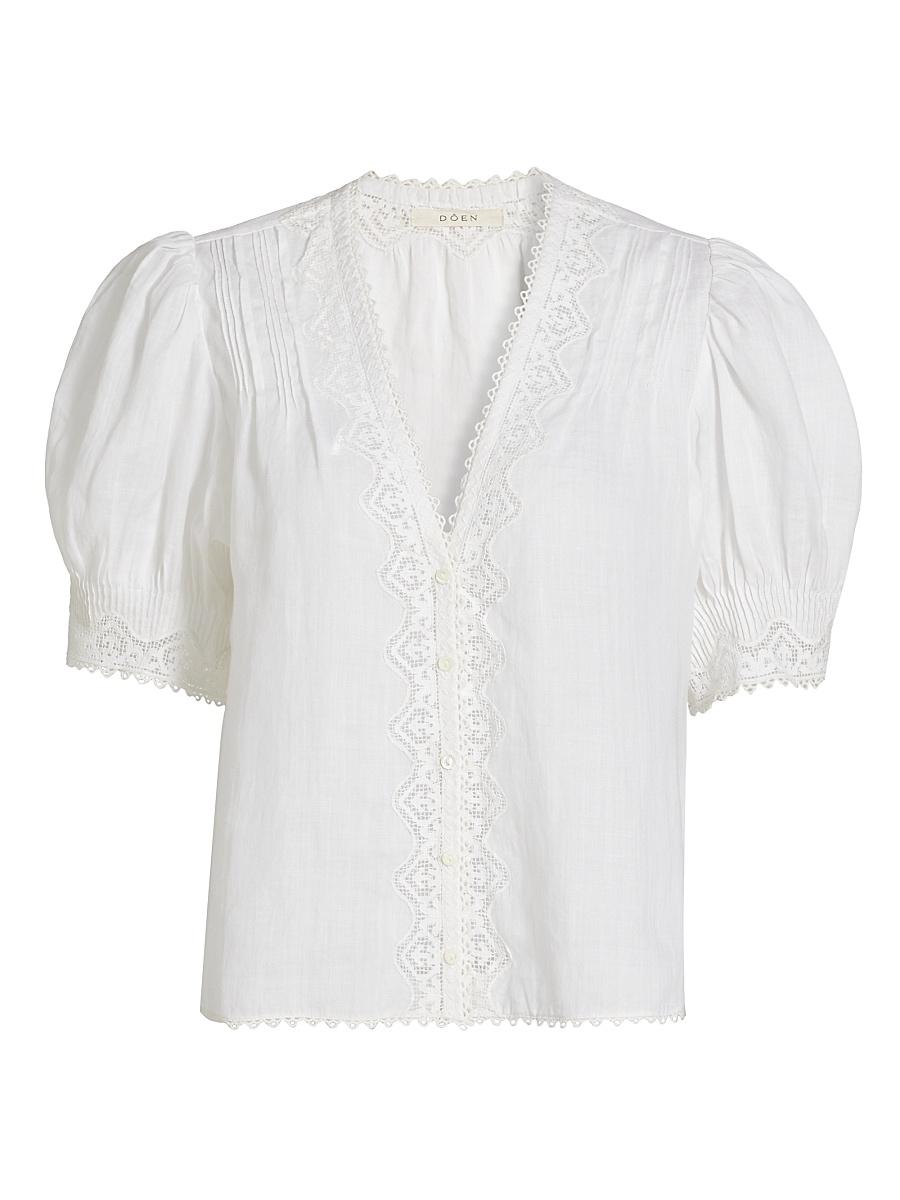 Crafted of linen, this Brigetta A-line top from DEN is designed with a V-neck, short puff sleeves, and delicate eyelet trim. V-neck Short puff sleeves, pintuck cuffs Pulls over 100% ramie linen Dry clean only Imported SIZE & FIT About 21.5 from shoulder to hem Model measurements: 510 tall Model is wearing a US size Small. Contemporary Sportswear - Workshop > Den > Saks Fifth Avenue. DEN. Color: Salt. Size: Small.