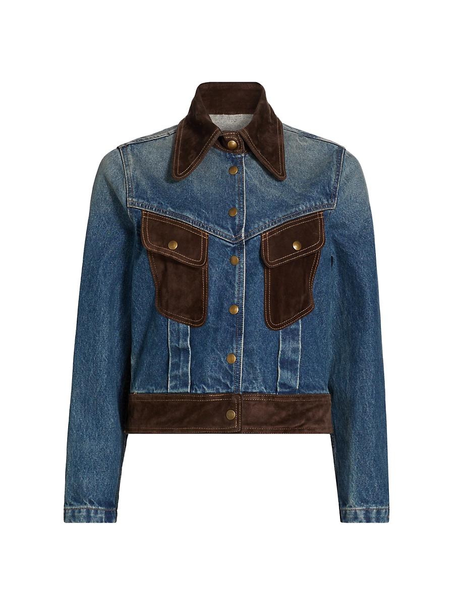 This Brooklyn denim jacket from Nili Lotan is designed with a spread collar, flap pockets, and suede trim. Spread collar Long sleeves Chest snap flap patch pockets Front snap closure 100% cotton Trim: 100% suede Machine wash Made in USA SIZE & FIT Model measurements: 510 tall Model is wearing a US size Small. Designer Lifestyle - Nili Lotan > Nili Lotan > Saks Fifth Avenue > Barneys. Nili Lotan. Color: Simon Wash. Size: XL.