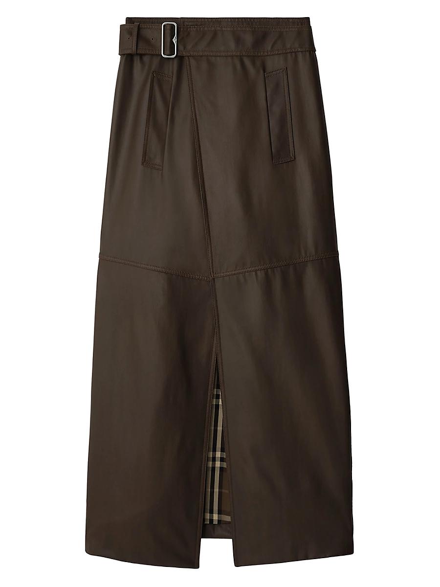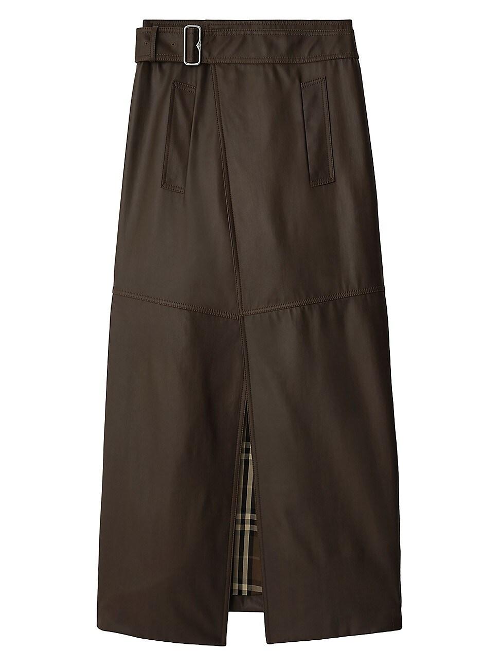 Burberrys floor-length skirt is crafted of a coated wool-blend twill. The A-line style features a belted waist and a diagonal front slit to reveal the Burberry Check cotton lining. Belted waist Side slip pockets Front slit 72% wool/28% polyamide Lining: 100% cotton Pocket lining: 100% cotton Dry clean Made in Italy ABOUT THE BRAND Founded in 1856 by 21-year-old Thomas Burberry, the brand set out with a mission to stylishly protect against British weather-and Burberrys iconic trench coat was born. In the 1920s, its renowned check pattern was introduced as the coats lining. Today, under Creative Director Daniel Lee, the heritage brand continues to evolve and create timelessly classic mens, womens and kids pieces, along with beauty. Advanced Designer - Burberry > Burberry > Saks Fifth Avenue > Barneys. Burberry. Color: Bramble. Size: 6.
