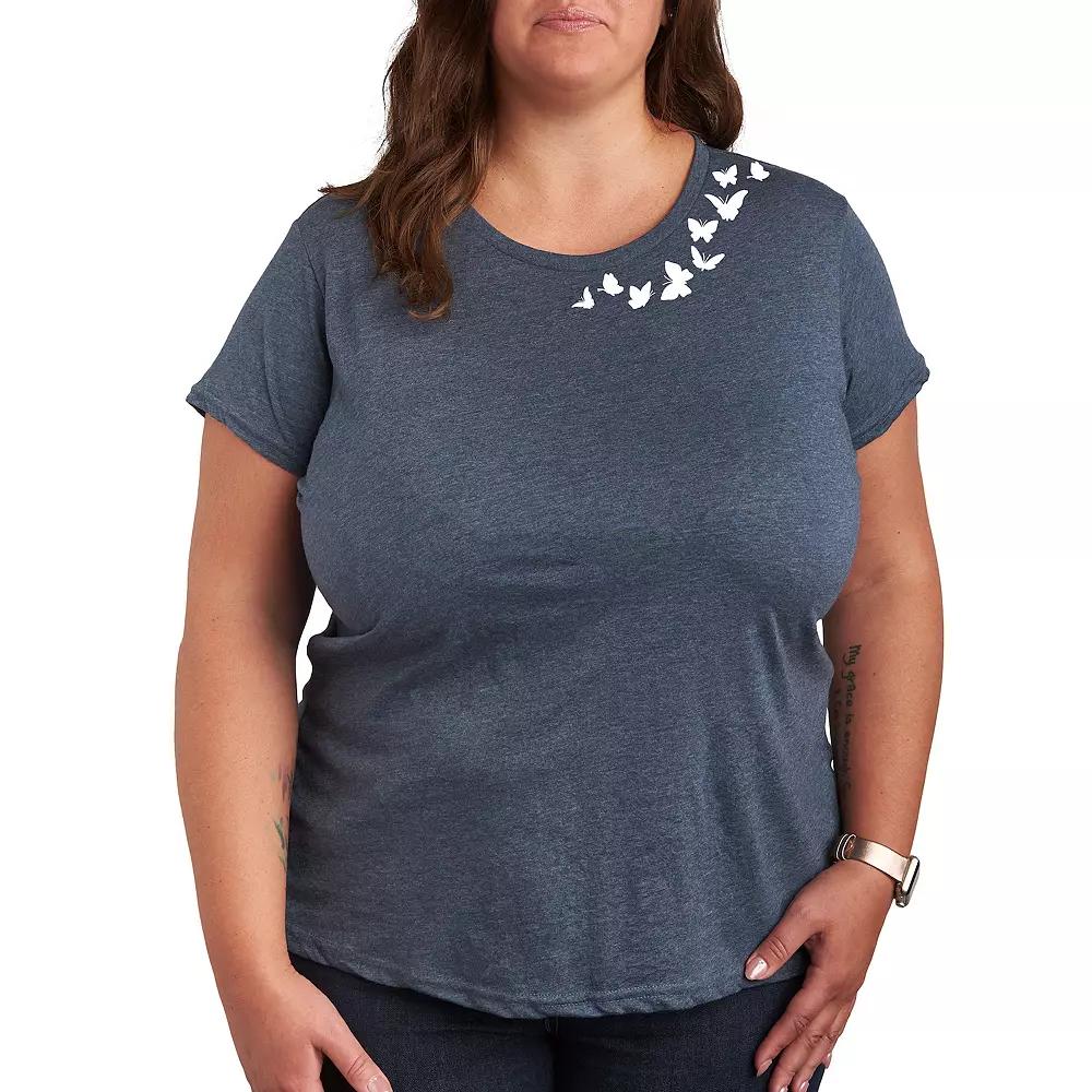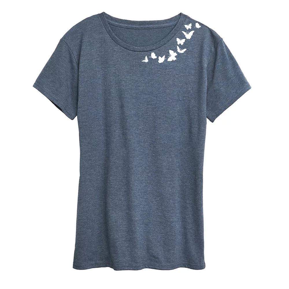 Heather Blue Butterflies Side-Hit Graphic Tee - Women, Juniors, Plus & Petite Plus. Casual cotton-blend tee featuring a scoop neckline with a contrast graphic design.Full graphic text: Live happy.Size S: 26 long from high point of shoulder to hemSize & fit: Relaxed-fit garment with a slightly longer hem. Fits true to size.50% cotton / 50% polyesterMachine wash; tumble dryImported, screen printed in the USA