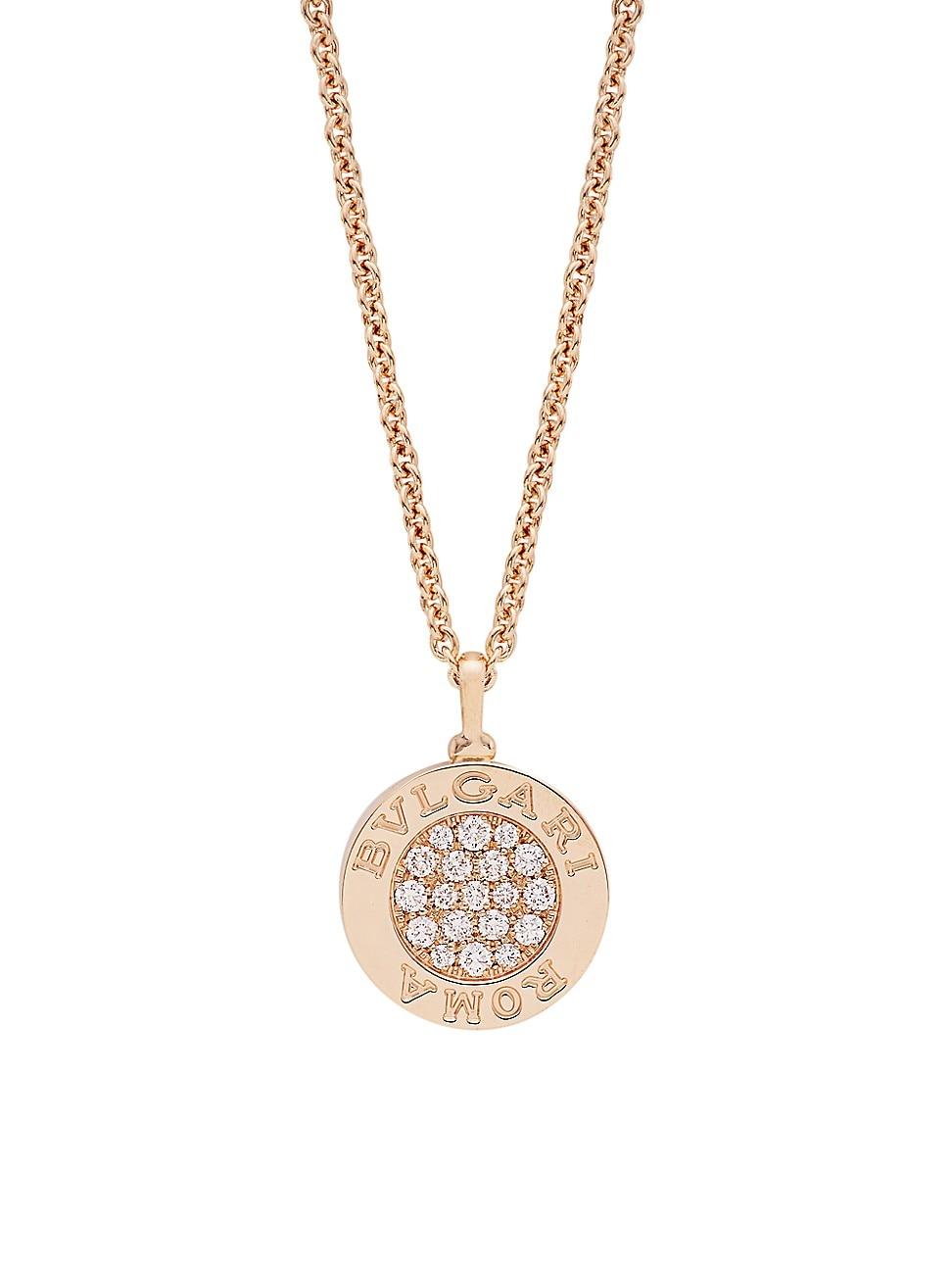 An elegant fusion of Roman heritage and contemporary design, BVLGARIs pendant necklace is crafted of 18K rose gold. Inspired by the inscriptions on ancient coins, it features a pendant with a mother-of-pearl insert and dazzling pav diamonds with the labels signature double logo border. Diamonds 0.25ct tcw Mother of pearl 18K rose gold Clasp closure Made in Italy SIZE Adjustable 17 length ABOUT THE BRAND Founded in Italy in 1884 by Greek silversmith Sotirio Bulgari, BVLGARI has become synonym