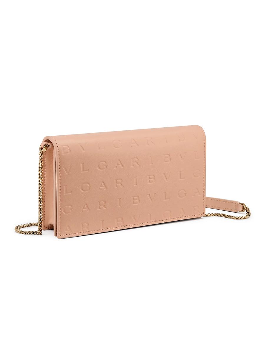 From the BVLGARI BVLGARI Collection. BVLGARIs chain wallet is made in Italy from luxurious leather characterized by the brands signature allover heat-stamped Infinitum logo pattern. The versatile accessory features a removable chain and leather strap. Removable shoulder strap Exterior: one slip and one zip pocket Interior: two slip pockets and six card slots Flap with magnetic closure Leather Lining: leather Made in Italy SIZE About 7.5W x 4H x 1.75D Removable shoulder strap: about 19 drop ABOUT THE BRAND Founded in Italy in 1884 by Greek silversmith Sotirio Bulgari, BVLGARI has become synonymous with unparalleled craftsmanship and exquisite jewelry. The brands Roman heritage can be seen in pieces inspired by the citys architecture, artwork and ancient mosaics. Today, the house continues to translate its rich history into opulent designs and fragrances. Handbags - Italian Designers > Bvlgari > Saks Fifth Avenue > Barneys. BVLGARI. Color: Pink.
