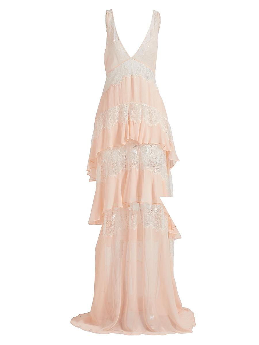 Crafted of soft silk, the Callista maxi dress from LoveShackFancy features delicate lace inserts and romantic tiered ruffles. Plunging V-neck and back Sleeveless Pulls over 100% silk Dry clean Imported SIZE & FIT Model measurements: 510 tall Model is wearing a US size 4. Contemporary Sportswear - Trend > Loveshackfancy > Saks Fifth Avenue. LoveShackFancy. Color: Lingerie Peche. Size: 8.