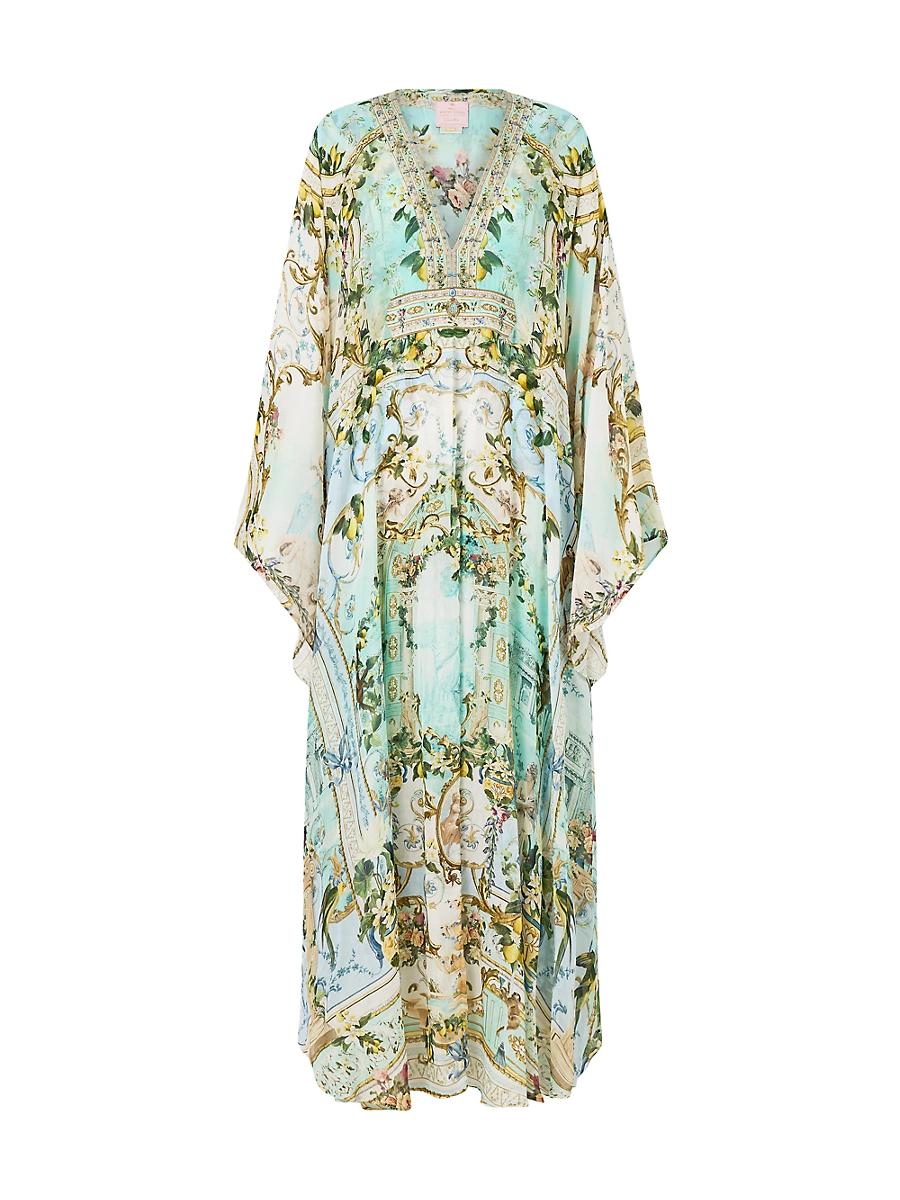 ONLY AT SAKS. The White Lotus x Camilla collaboration takes cues from the shows locales-Hawaii, Sicily, and Thailand-creating a collection infused with tropical, Baroque, and jungle-inspired prints. Featuring standout pieces like caftans, dresses, and accessories, each design embodies the vibrant luxury, bold aesthetic, and captivating drama of these two iconic brands. Crafted of silk, this maxi-length caftan showcases a sharp V-neck framed by draped kimono-inspired sleeves. V-neck Long sleeves Pulls over 100% silk Dry clean Imported SIZE & FIT Model measurements: 510 tall Please note: This item is one size. Outerwear And Swimwear - Contemporary Swim > Camilla > Saks Fifth Avenue > Barneys. Camilla. Color: Venus On A Vespa.