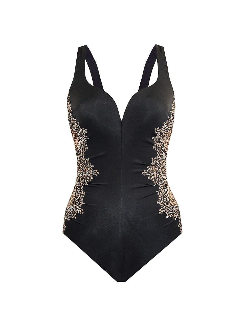 From the Cappadocia Collection. Look 10 lbs. lighter in 10 seconds. Miratex fabric slims and slenderizes without panels or linings for total full body shaping and control. The Temptress swimsuit from Miraclesuit is adorned with an engineered print and side shirring to create an hourglass waist. Sweetheart neck Sleeveless Soft cups Pulls on 69% nylon/31% spandex Combo: 82% nylon/18% spandex Hand wash Imported SIZE & FIT Model measurements: 510 tall Model is wearing a US size 4. Outerwear And Swimwear - Modern Swim > Miraclesuit Swim > Saks Fifth Avenue > Barneys. Miraclesuit Swim. Color: Black Multi. Size: 8.