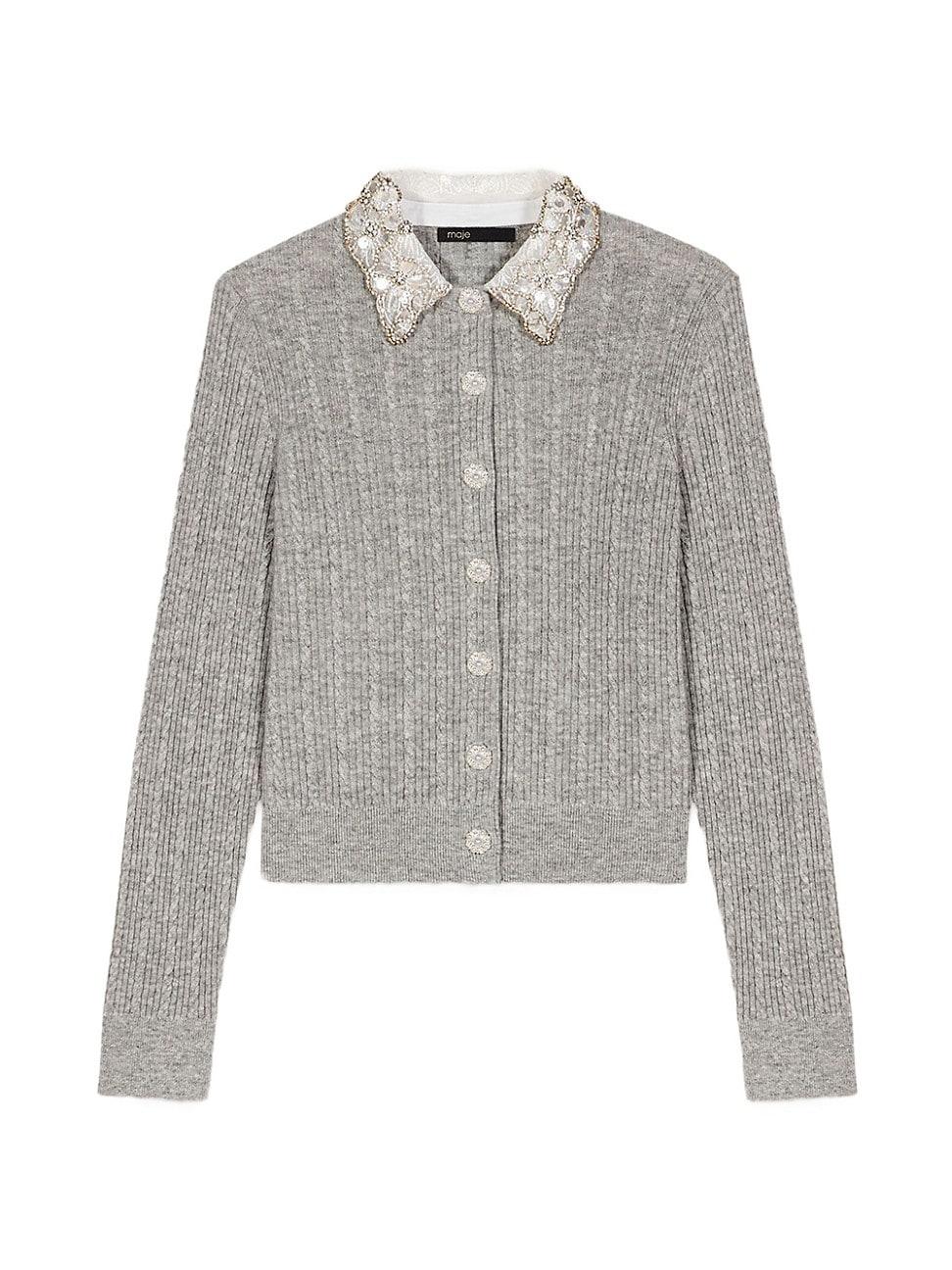 This cable-knit cardigan has a short, close-fitting cut. The meticulously hand-worked removable collar features embroidered pearl beads and sequins, while a jewellery button fastening adds a touch of sparkle to the look. Wear it with jeans, pumps and a bag for a casual look. Cropped cable knit cardigan Snug fit Removable jewellery collar, embroidery, beads and sequins Jewellery button fastening Ribbed trim Main material: 97% wool, 3% cashmere Neckline: 85% wool, 12% polyamide, 2% cashmere, 1% elastane Removable collar: 52% cotton, 25% polyamide, 23% polyester Imported SIZE & FIT Model measurements: 59 Model is wearing a size 1. Lsd Rtw - Maje > Maje > Saks Fifth Avenue > Barneys. Maje. Color: Grey. Size: Large.