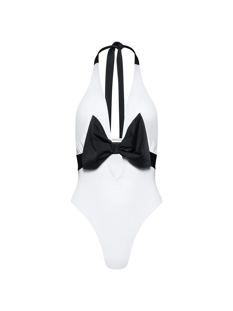 Black-tie swim-what a concept. The Carolina One-Piece boasts a daring neckline and a decidedly formal black bow-perfect for a glamorous moment. Tie halter neck swimsuit Sustainably made in America Hand wash cold and line dry 85% Nylon, 15% Spandex SIZE & FIT This item fits true to size Model is 58 and is wearing a size s About the Brand Nostalgia for the past-Brigitte Bardot films, classic Cartier pieces, Slim Aarons photographs-guides the hand of Stefana Tabacaru, the designer of Tabacaru. Made in America, sustainably, each piece features flattering cuts and clean lines crafted from the finest materials to help women feel like the best version of themselves. Lsd Rtw - Womens Rtw Lsd Mp > Tabacaru Swim > Saks Fifth Avenue > Barneys. Tabacaru Swim. Color: White. Size: Large.
