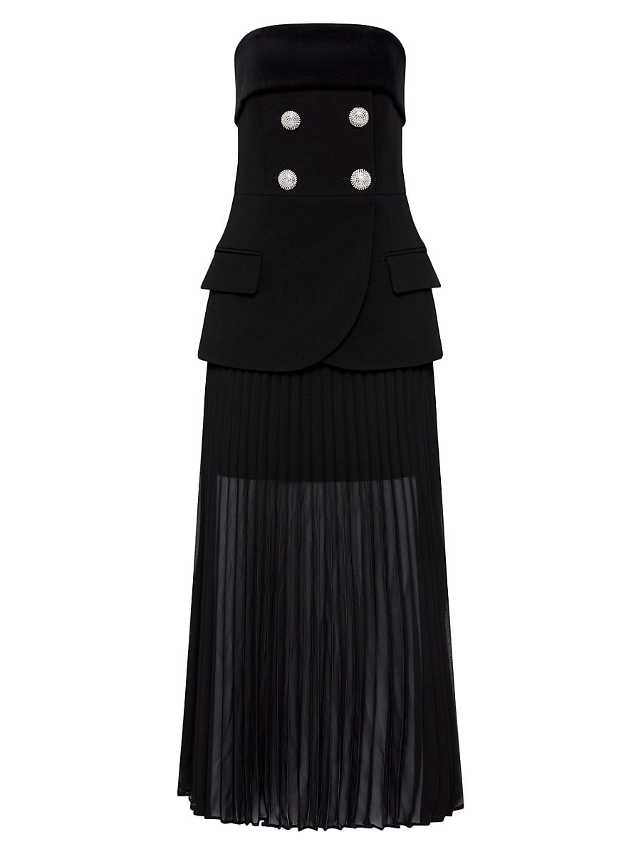 This Celia strapless midi-dress from Rebecca Valance is styled with a bandeau neck, pearl button detailing, and a sheer pleated skirt. Bandeau neck Strapless Side flap pockets Side zip closure 98% polyester/2% elastane Dry clean Imported SIZE & FIT About 44.75 from shoulder to hem Model measurements: 510 tall Model is wearing a US size 4. Dress Collections - Contemporary Evening > Rebecca Vallance > Saks Fifth Avenue > Barneys. Rebecca Vallance. Color: Black. Size: 2.