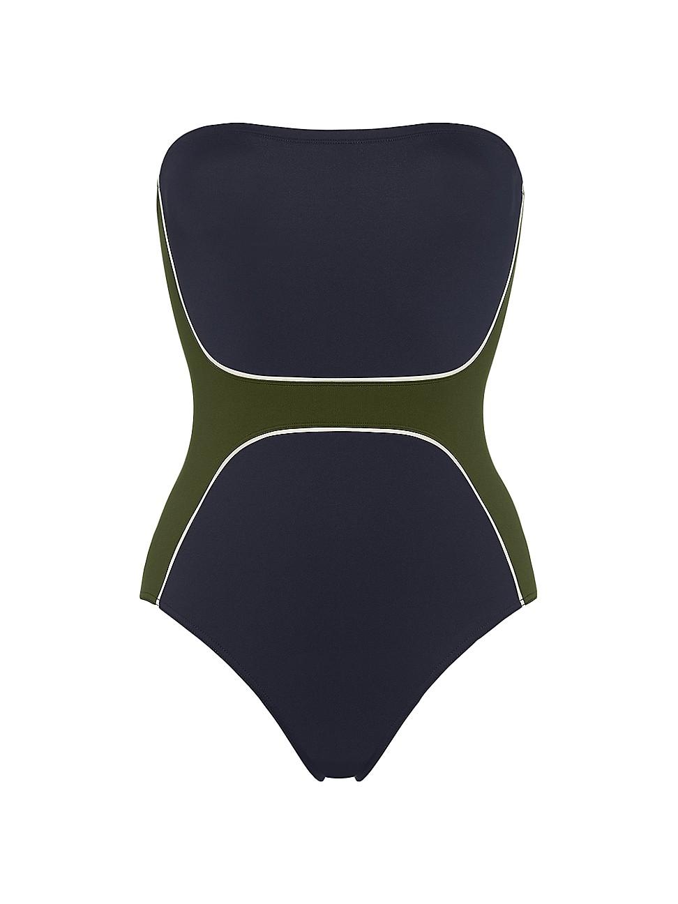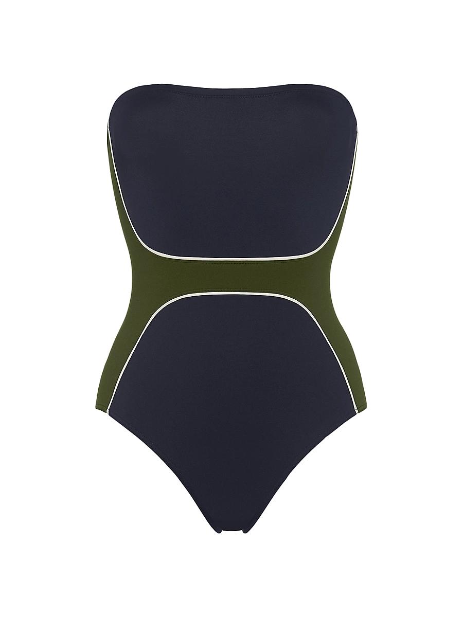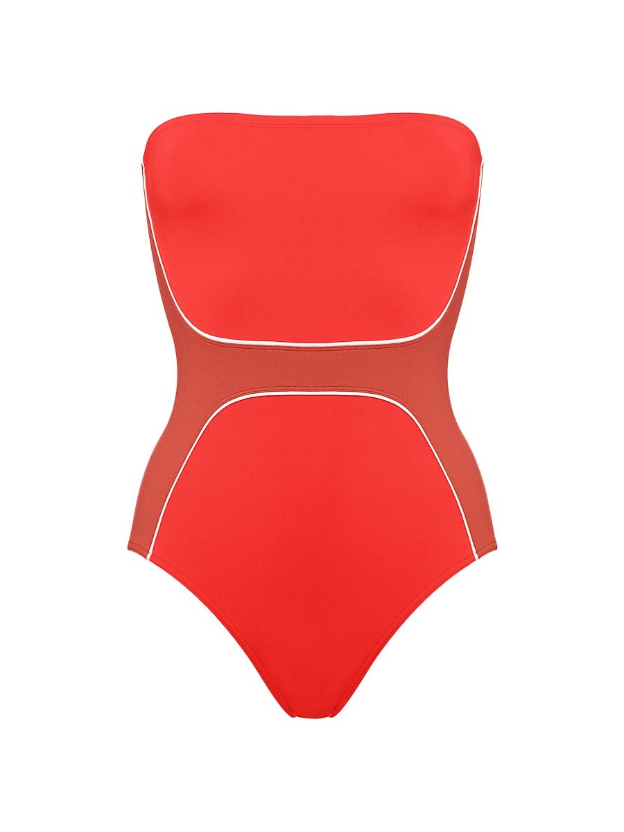 ERESs one-piece bustier swimsuit features contrasting yokes on the sides and front with percale piping, gripper tape, a straight back, and a lined front for a sleek fit. Bandeau neck Strapless Pulls on 84% polyamide/16% spandex Machine wash Made in France Please note: This item runs small. We recommend ordering one size up. Outerwear And Swimwear - Eres > Eres > Saks Fifth Avenue > Barneys. ERES. Color: Ecarlate Ete Indien. Size: 6.
