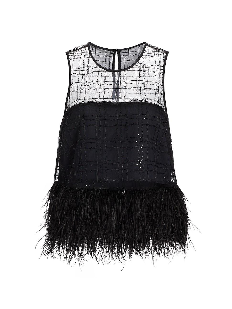Cinq Septs Charisse top is crafted of organza with delicate rhinestone trim. The shell features layered feathers around the hem. Round neck Sleeveless Feather hem Back button keyhole closure 100% polyester Dry clean Imported SIZE & FIT About 20.25 from shoulder to hem Model measurements: 510 tall Model is wearing a US size Small ABOUT THE BRAND Inspired by the radiant, magical hours between 5 and 7 PM-which is what the labels French name translates to-founder Jane Siskin designs sophisticated, feminine pieces for both workweek and the weekend. The designers silhouettes also play with volume and eye-catching trimmings-perfect for cocktails or a special night out. Contemporary Sportswear - Cinq A Sept > Cinq Sept > Saks Fifth Avenue > Barneys. Cinq Sept. Color: Black. Size: Large.