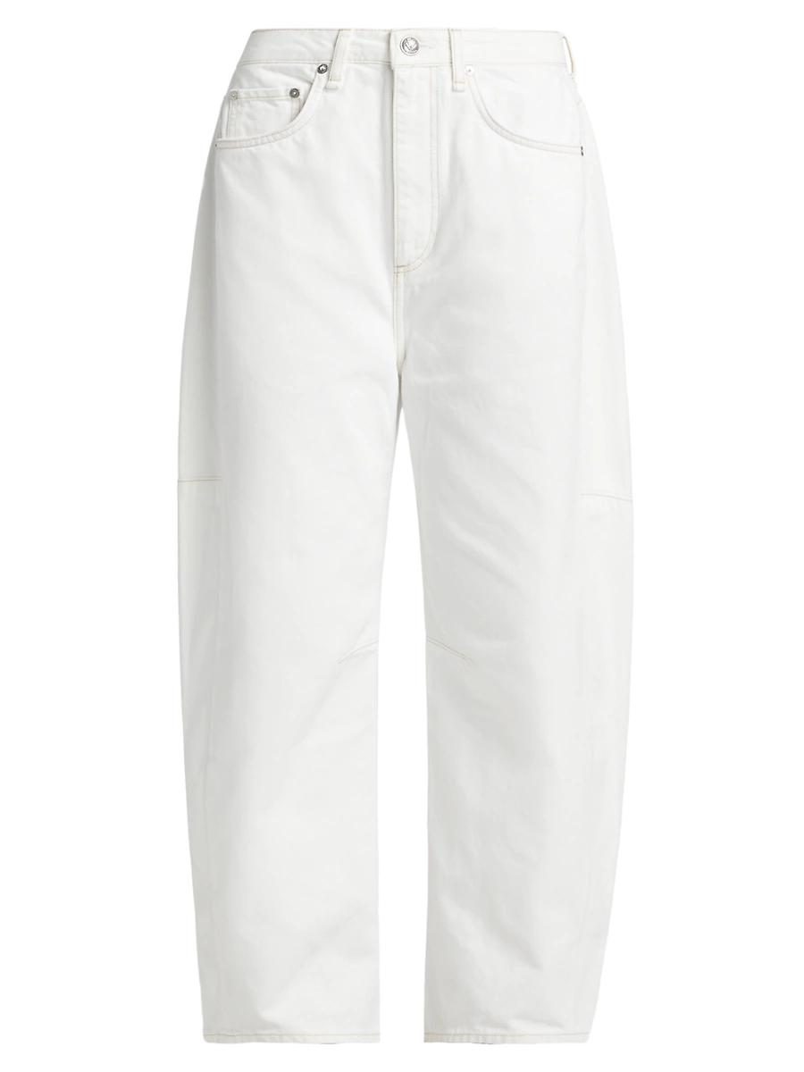 Crafted of rigid cotton denim, the Charlie jeans from rag & bone are cut in a high-rise, barrel-leg silhouette. Classic five-pocket styling lends comfort to this pair. Five-pocket style Zip fly, button closure 100% cotton Machine wash Imported SIZE & FIT This style is constructed in a woven, no-stretch fabric for a tailored fit Rise: about 13.25 Inseam: about 25.5 Leg opening: about 17.5 Model measurements: 510 tall Model is wearing a US size 4 ABOUT THE BRAND In 2002, rag & bone founder Marcus Wainwright combined his British heritage with a downtown-New York aesthetic to set the tone for the label. At the heart of the edgy-yet-laid-back brand is its focus on quality craftsmanship and attention to detail. The epitome of cool, off-duty style, its no wonder the signature second-skin denim is favored by many. Contemporary Sportswear - Denim And Bottoms > Rag & Bone > Saks Fifth Avenue > Barneys. rag & bone. Color: White. Size: 29.