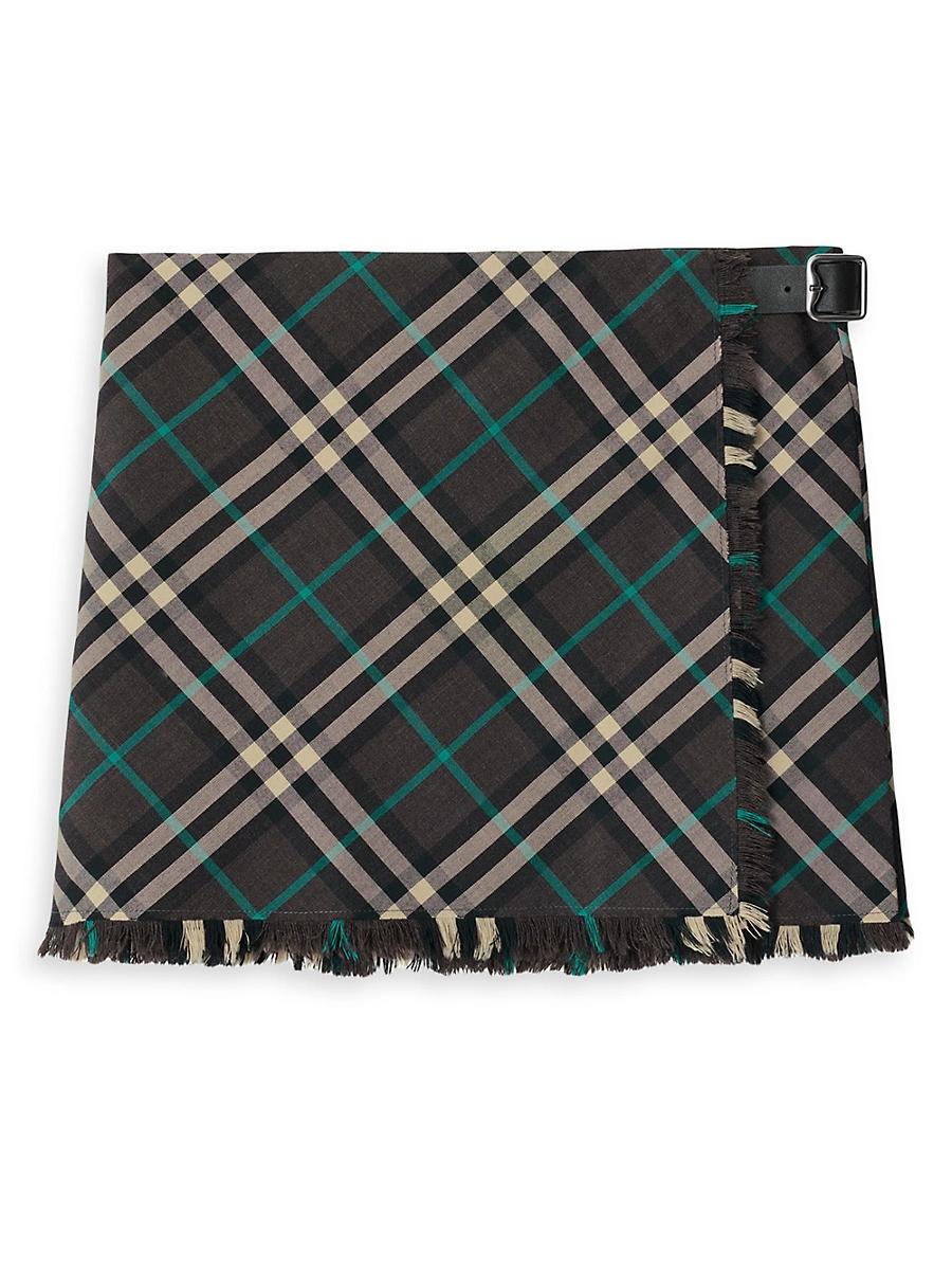 Inspired by a traditional kilt, Burberrys pleated wrap miniskirt is designed with the labels signature check. This piece is styled with a back box pleat, a leather side buckle closure, and fringe trim. Adjustable belt,button closure Fringe trim 55% polyester/45% wool Combo: 100% leather Dry clean Made in UK SIZE & FIT About 15.75 long Model measurements: 510 tall Model is wearing a US size 4 ABOUT THE BRAND Founded in 1856 by 21-year-old Thomas Burberry, the brand set out with a mission to stylishly protect against British weather-and Burberrys iconic trench coat was born. In the 1920s, its renowned check pattern was introduced as the coats lining. Today, under Creative Director Daniel Lee, the heritage brand continues to evolve and create timelessly classic mens, womens and kids pieces, along with beauty. Advanced Designer - Burberry > Burberry > Saks Fifth Avenue > Barneys. Burberry. Color: Snug Check. Size: 4.