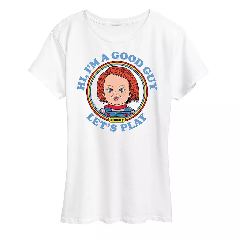 She will love showing off her style with this Womens Chucky Chucky Lets Play Graphic Tee. FEATURES Short sleeves ScoopneckFABRIC & CARE Light Gray and Heather Colors: Cotton/Polyester ; Solid Colors: Cotton Machine wash Imported Size: Large. Color: White. Gender: female. Age Group: adult.