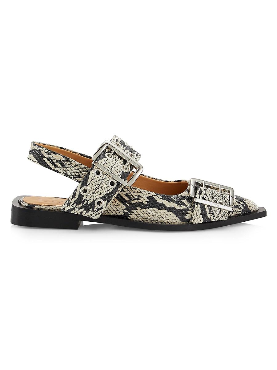 Crafted of faux snake-embossed leather, these slingback flats from Ganni are styled with chunky buckles. Point toe Slips on Textile upper Tunit sole Made in Portugal. Womens Shoes - Workshop Shoes > Ganni > Saks Fifth Avenue > Barneys. Ganni. Color: Sand. Size: 6.
