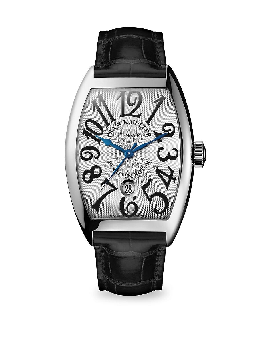 Refined timepiece boasts the distinctive curved design and unique contours of the brands most distinctive silhouette. Elegant stainless steel case with stunning sunray dial and blue hands on a textured alligator strap. Automatic movement Polished stainless steel bezel Sapphire crystal White sunray dial Arabic numeral hour markers Date display at six oclock Blue hands Second hand Pin buckle closure Two year warranty Made in Switzerland FEATURES Water resistant to 3 ATM SIZE Tonneau stainless steel case, 47mm (1.85) Alligator strap, 34mm (1.33). Fine Jewelry - Fine Watches > Franck Muller > Saks Fifth Avenue > Barneys. Franck Muller. Color: Black.
