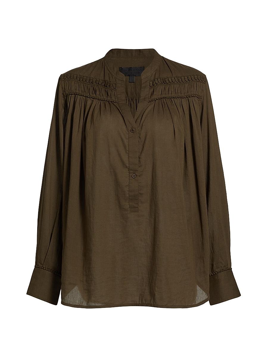 Nili Lotans Clarys top is defined by a gathered design, crafted of crisp cotton with a breezy, long-sleeved silhouette and a split collar Split collar Long sleeves, button cuffs Button-front closure 100% cotton Dry clean Imported. SIZE & FIT Model measurements: 510 tall Model is wearing a US size Small Please Note: Compared to the Saks Size Guide, this style measures true to size. Designer Lifestyle - Nili Lotan > Nili Lotan > Saks Fifth Avenue > Barneys. Nili Lotan. Color: Olive Green. Size: Small.