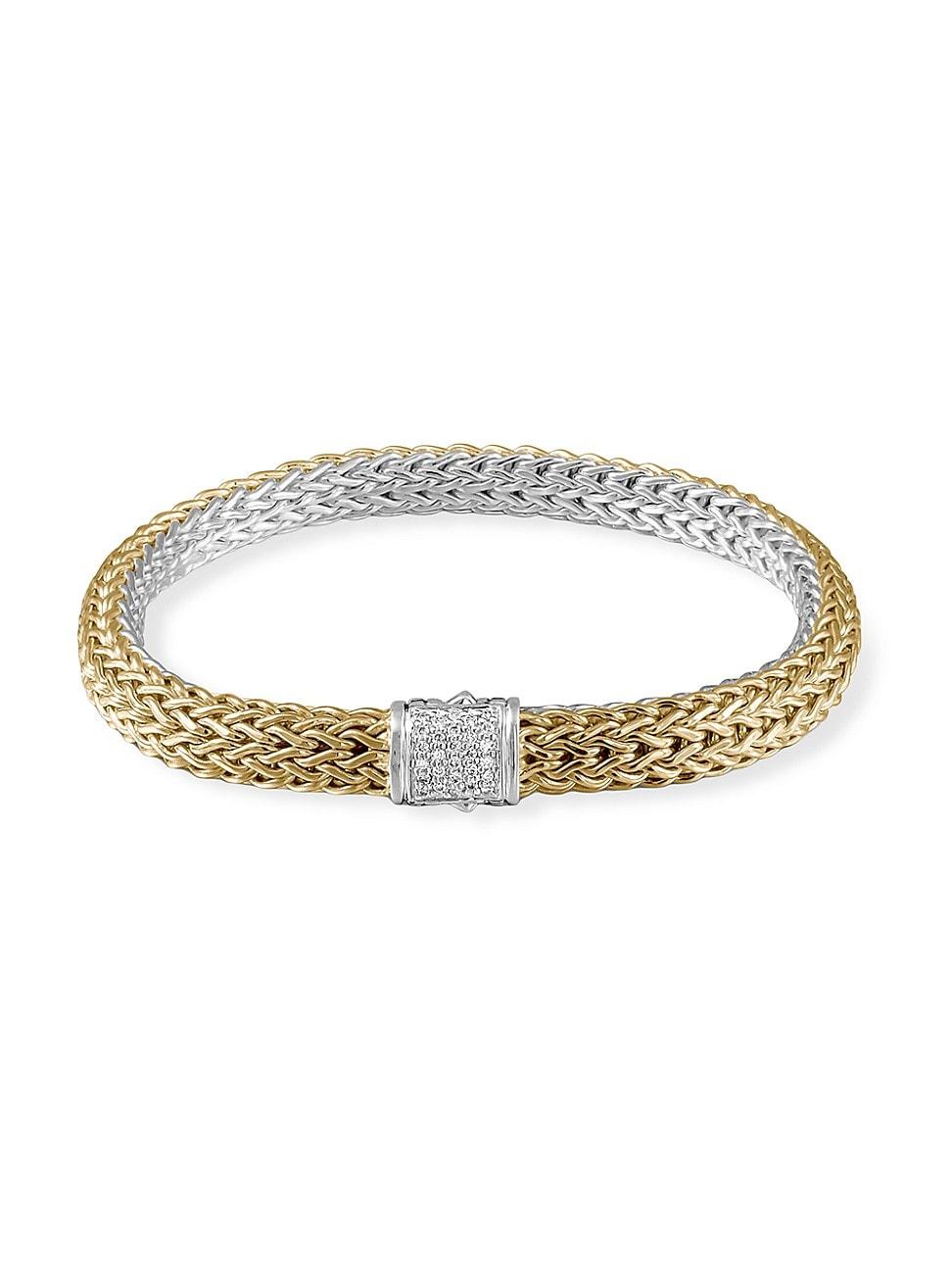 From the Classic Chain Collection. Crafted of signature woven rope chain, John Hardys Classic Chain Reversible bracelet has a unique two-tone effect with sterling silver and 18K gold construction centered by a diamond pav clasp. Diamonds, 0.14 tcw Diamond color: I-J Diamond clarity: I1 18K yellow gold Sterling silver Integrated push clasp Imported SIZE Width, about 0.2. Fashion Jewelry - John Hardy > John Hardy > Saks Fifth Avenue > Barneys. John Hardy. Color: Gold. Size: Medium.