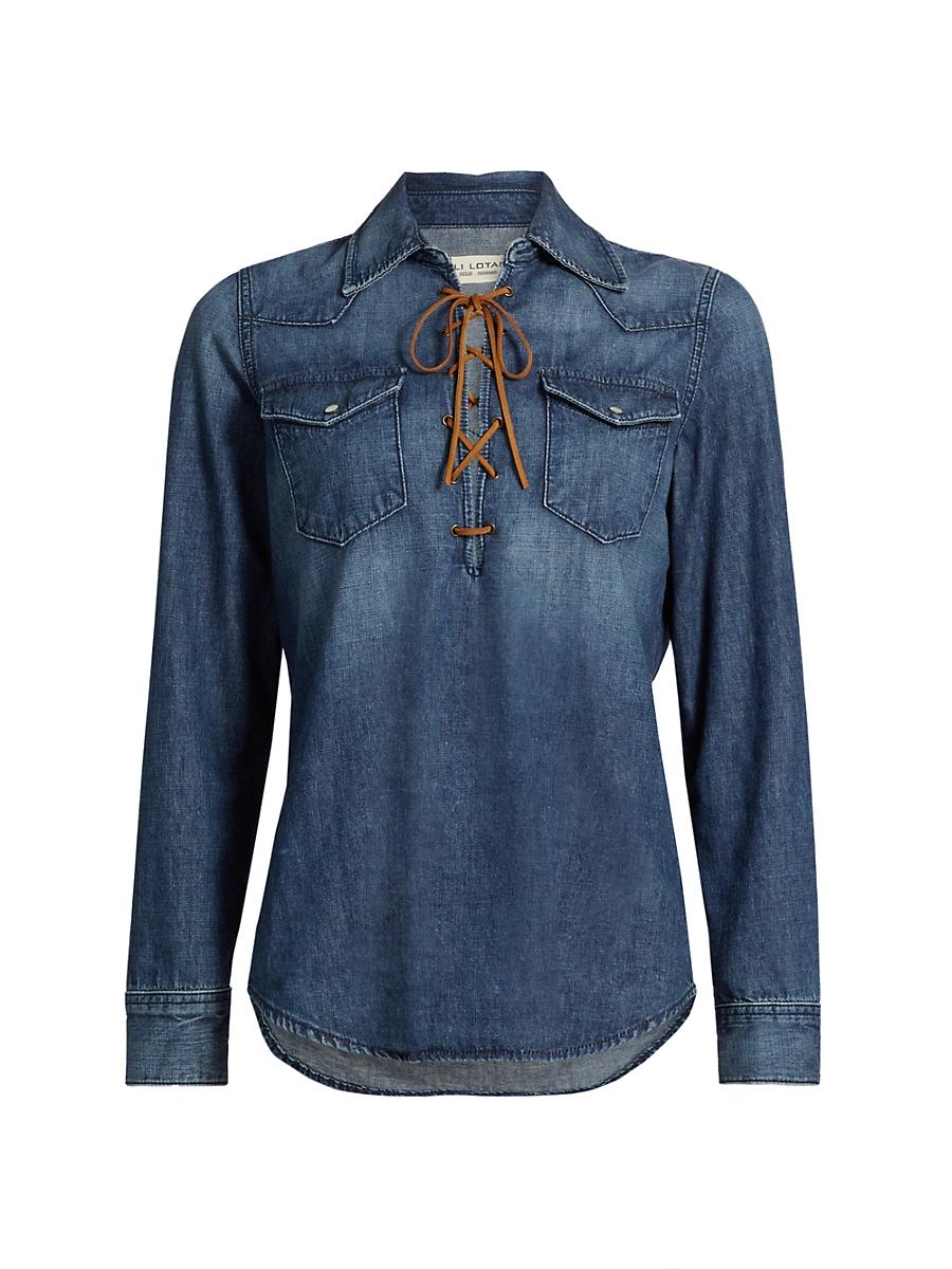 Crafted of cotton, this Collins denim shirt from Nili Lotan is designed with a spread collar, utility pockets, and a lace-up closure. Spread collar Long sleeves Chest snap patch pockets Front lace-up closure 100% cotton Dry clean Made in USA SIZE & FIT Model measurements: 510 tall Model is wearing a US size Small Please Note: Compared to the Saks Size Guide, this style measures true to size. Designer Lifestyle - Nili Lotan > Nili Lotan > Saks Fifth Avenue > Barneys. Nili Lotan. Color: Classic Wash. Size: Small.