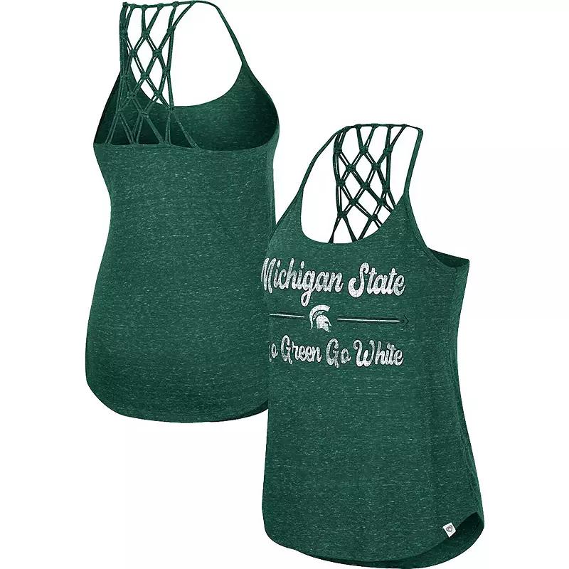 Beat the heat while flaunting your Michigan State Spartans style in this Glenda scoop neck tank top from Colosseum. It offers a lightweight fabric, racerback design and spaghetti straps to help you enjoy the perfect amount of breathability and sun on your skin. Plus, the distressed Michigan State Spartans graphics offer a vintage look, while the macrame back makes it the ultimate warm-weather favorite.Beat the heat while flaunting your Michigan State Spartans style in this Glenda scoop neck tank top from Colosseum. It offers a lightweight fabric, racerback design and spaghetti straps to help you enjoy the perfect amount of breathability and sun on your skin. Plus, the distressed Michigan State Spartans graphics offer a vintage look, while the macrame back makes it the ultimate warm-weather favorite.PRODUCT FEATURESMacrame backOfficially licensedImportedBrand: ColosseumMachine wash, tumble dry lowRacerbackRounded droptail hemMaterial: 65% Polyester/35% RayonDistressed details for a vintage lookSleevelessScoop neckScreen print graphicsSpace dyed fabric Size: XL. Color: Green. Gender: female. Age Group: adult.
