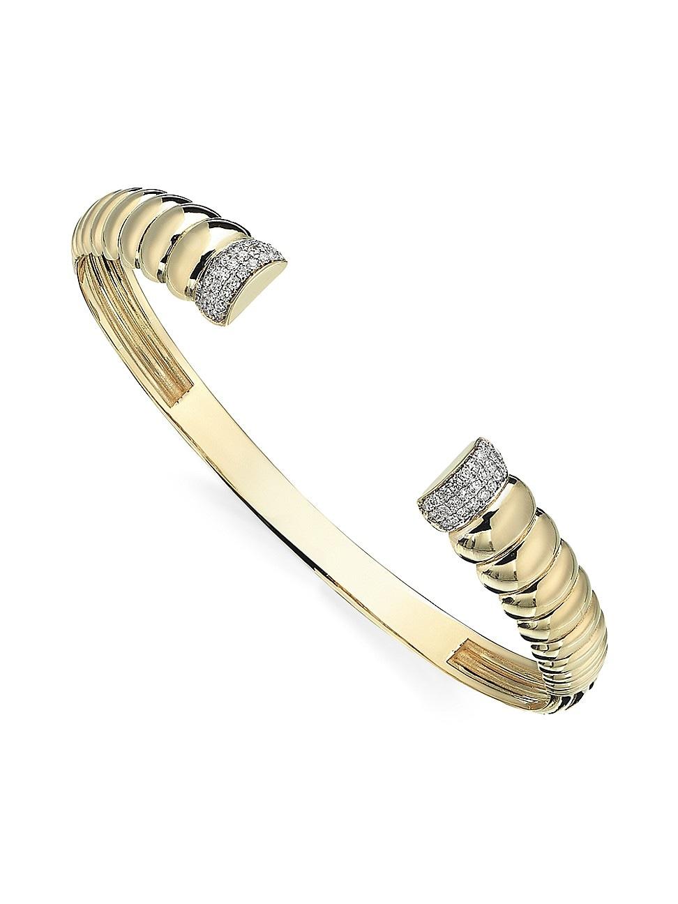 From the Connected Collection. Made of 14K yellow gold, SIM and ROZs fluted Morphose cuff is tipped with three rows of glittering pav diamonds. Diamonds, 0.47 tcw Diamond color grade: F-G Diamond clarity grade: VS2 14K yellow gold Slip-on Imported SIZE Diameter, about 2.5. Fashion Jewelry - Semi Prec Coll C > Sim And Roz > Saks Fifth Avenue > Barneys. Sim and Roz. Color: Yellow Gold.