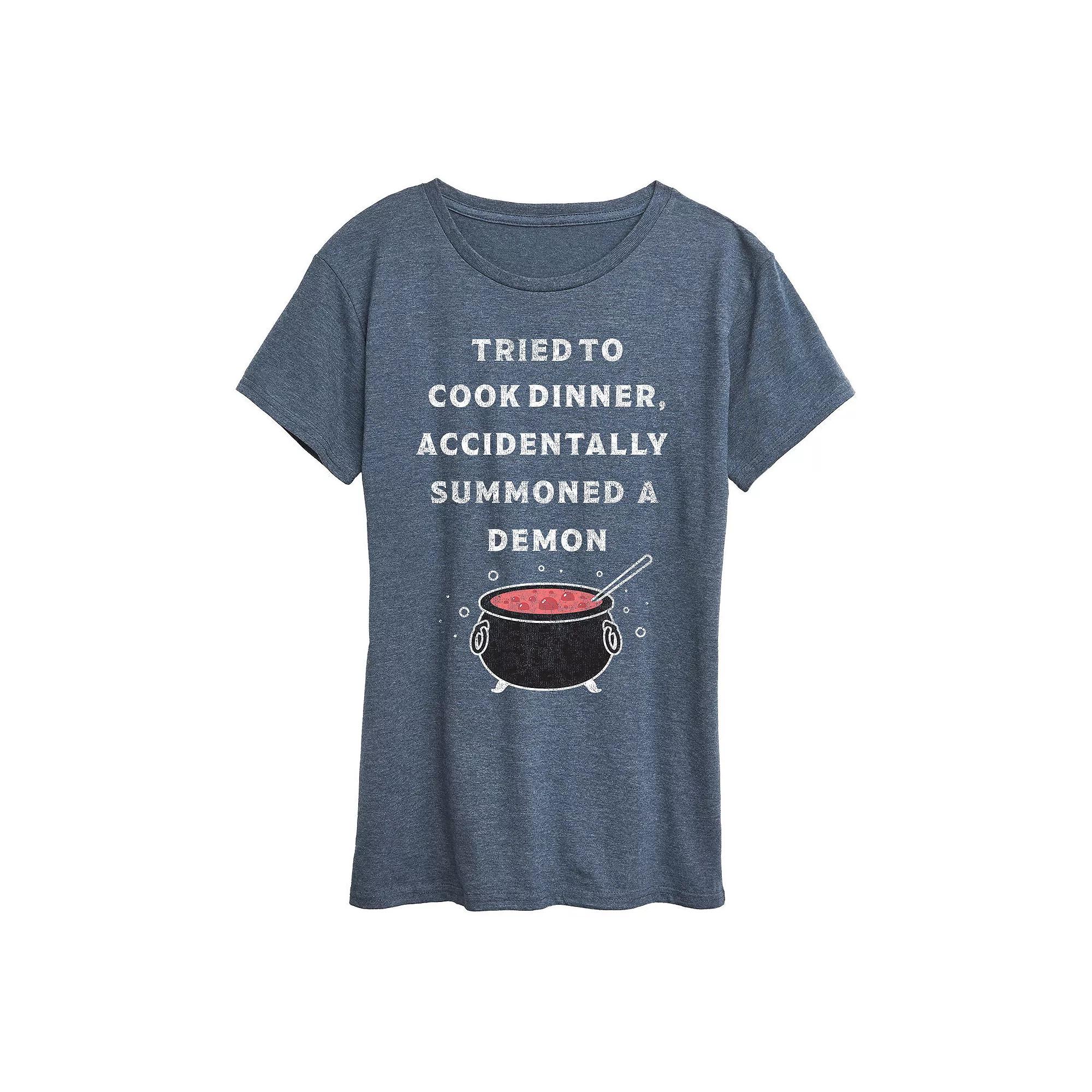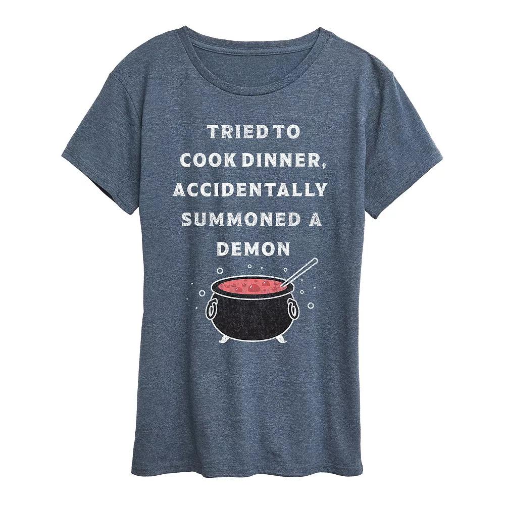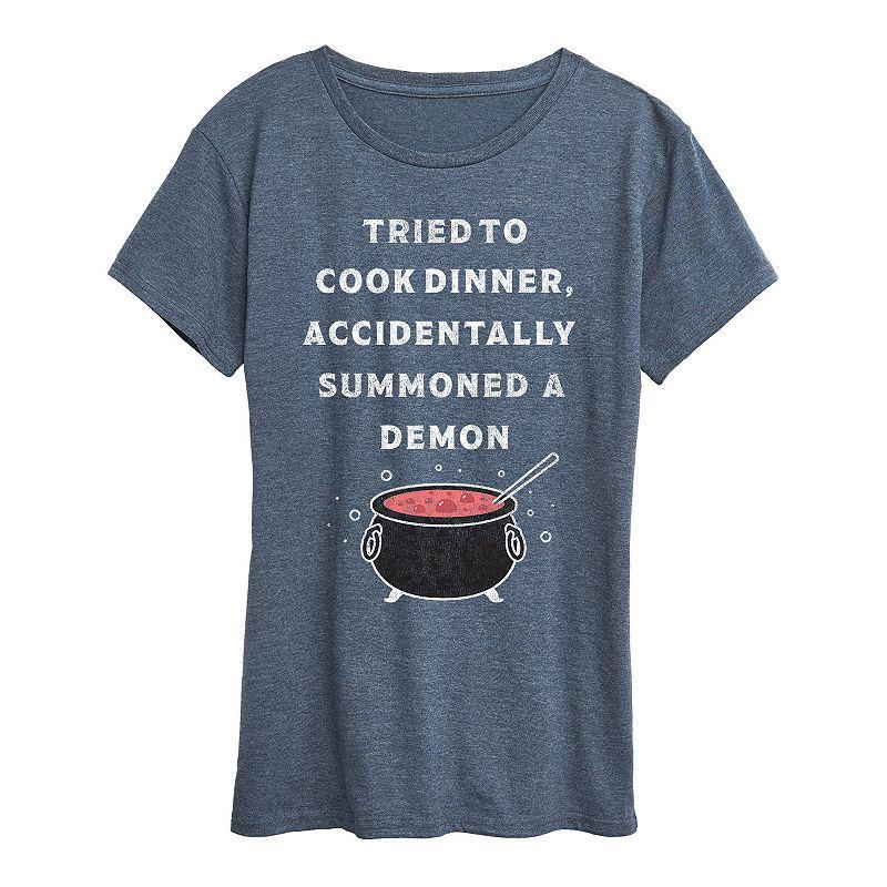 Heather Blue Calderon Accidentally Summoned A Demon Relaxed-Fit Tee - Women, Plus & Petite Plus. A comfortable fit meets an ultra-cool graphic in the form of this soft cotton-blend tee designed to refresh your casual wardrobe.Full graphic text: Tried to cook dinner. Accidentally summoned a demon.Size S: 26 long from high point of shoulder to hem50% cotton / 50% polyesterMachine wash; tumble dryImported, screen printed in the USA