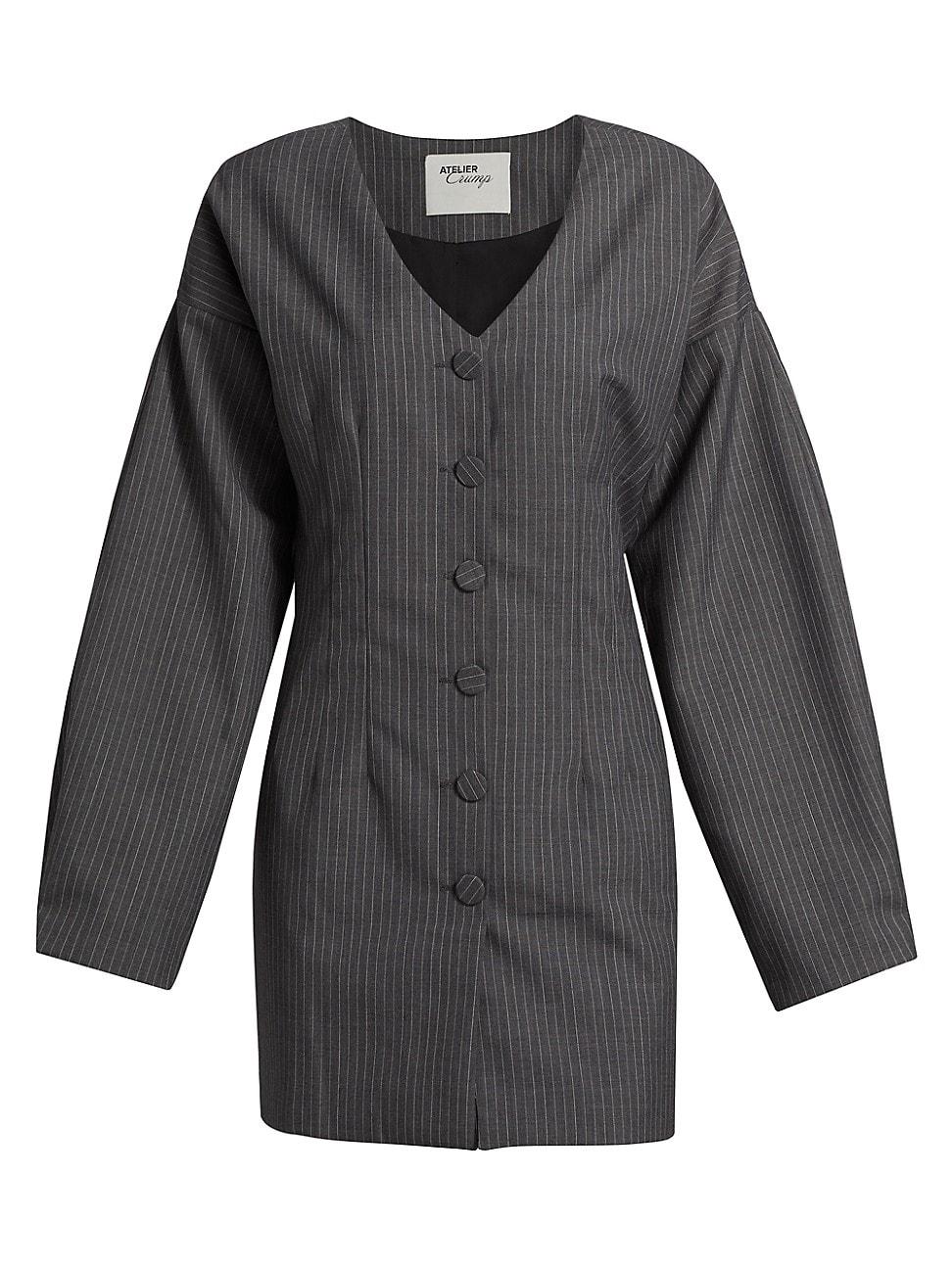 From the Copacabana Blues Collection. The Olivia dress from Atelier Crump is designed with classic pinstripes and tailored to a fitted silhouette with darting for shape. V-neck Drop shoulders Long sleeves, darted cuffs Darted waist Button-front closure 100% wool Lining: 96% polyester/4% spandex Dry clean Imported of Italian fabric SIZE & FIT About 33 from shoulder to hem Model measurements: 510 tall Model is wearing a US size Small. Contemporary Sportswear - Trend > Atelier Crump > Saks Fifth Avenue > Barneys. Atelier Crump. Color: Pinstripe Grey. Size: Medium.