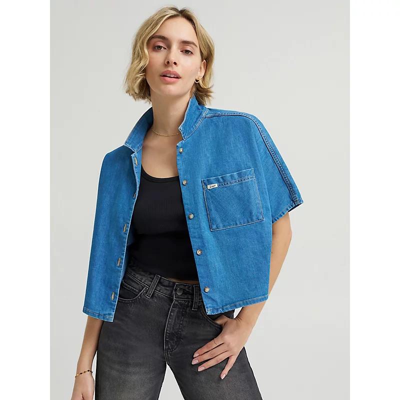 The resort shirt is embracing its shorter side. This cropped edition of a classic comes with the usual collared neck, capped sleeves, and logo buttons down the front, all in a smaller package. Made from a deep blue denim, this shirt is ready to cash in some vacation time. 75% Cotton, 17% Polyester, 5% Elastomltiester, 3% Elastane. Dye Star. M.
