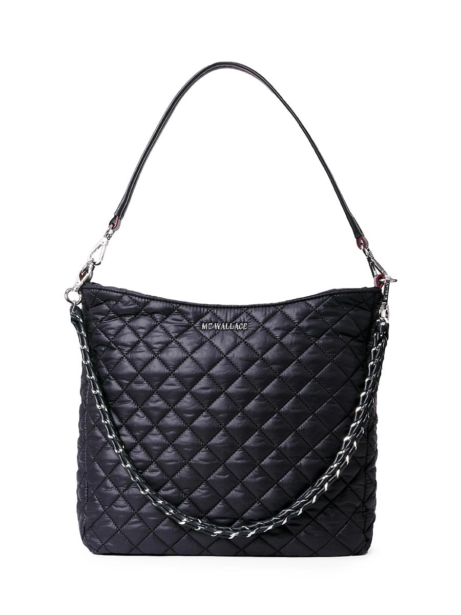 MZ WALLACE Crosby hobo bag in quilted nylon and calfleather Detachable woven chain shoulder strap Detachable, adjustable webshoulder strap Detachable flat shoulder strap Zip top closure Interior, one zip pocket and one slip pocket Removable zip pouch Exterior, back slip pocket Approx. 10.6H x 10.2W x 3.5D Imported