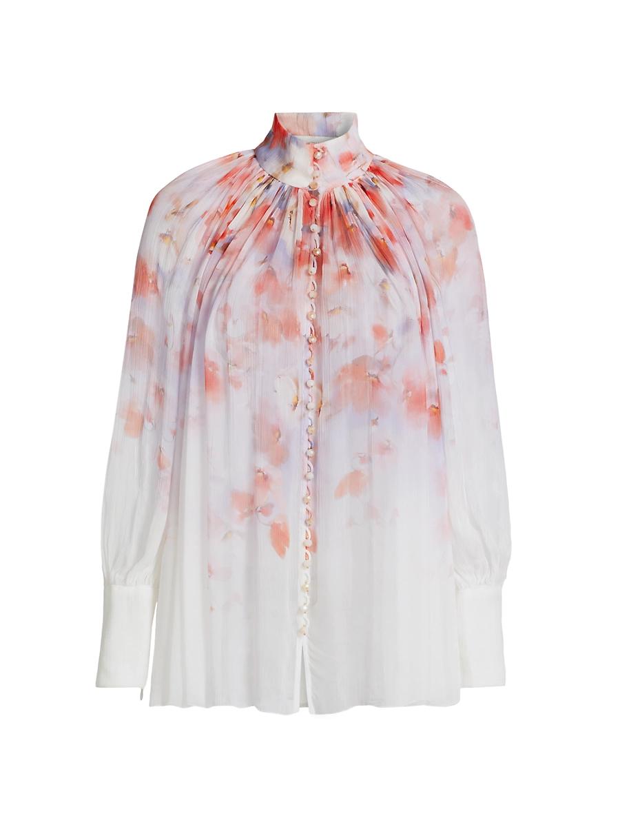 This Crush shirt from Zimmermann features a watercolor floral print, smocked yoke, and button-front closure. Stand collar Long sleeves, button cuffs Gathered yoke Button-front closure 100% viscose Lining: 86% polyester/14% elastane Dry clean Imported SIZE & FIT About 27.5 from shoulder to hem Model measurements: 510 tall Model is wearing a US size 4 ABOUT THE BRAND Australian founders and sister-duo Nicky and Simone Zimmermann design with a signature feminine aesthetic, each piece rife with tiers of fabric, rich embroidery and splashy prints. From ruffled bikinis and beachwear to luxe, intricately patterned maxi (and mini) dresses, everything is overtly romantic in the most elevated, effortless way. Contemporary Sportswear - Zimmermann > Zimmermann > Saks Fifth Avenue > Barneys. Zimmermann. Color: Scarlet Floral. Size: 10.